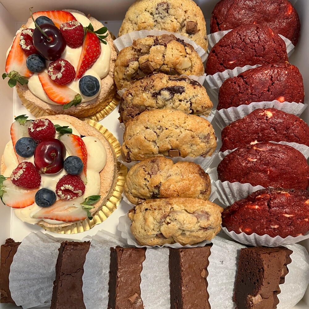 Дегустаційний бокс, що містить 6 одиниць шоколадного печива з волоськими горіхами, 6 одиниць червоного оксамитового печива з білим шоколадом, кожне печиво вагою 80 г, 4 порції шоколадного брауні вагою 85 г кожна та два міні-кекси «Дакуаї» з ніжним ванільним кремом та свіжими фруктами, такими як полуниця, ожина, малина, вишня, чорниця. Бісквіт виготовлений з мигдалю, але кожне міні-кекси важить 190 г. Свіжі фрукти можуть відрізнятися залежно від сезону.