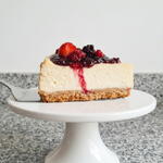 Основа з печива без глютену, ніжний крем-сир з джемом і червоними ягодами. Зберігати в холодильнику перед вживанням. 26 см розрахований на 12–16 порцій