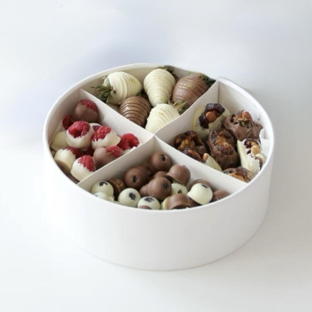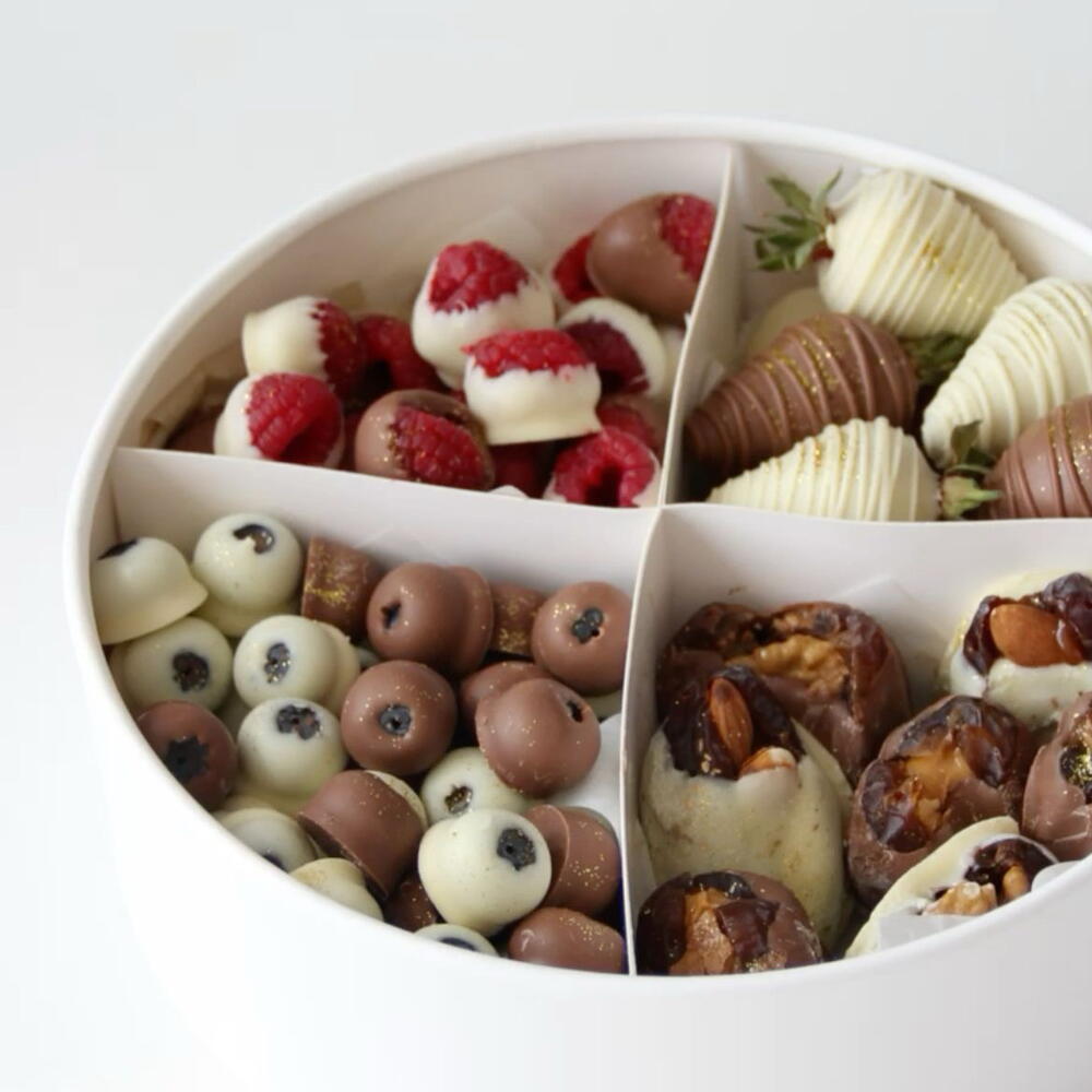 Ексклюзивна коробка для гурманів, яка поєднує елегантність, свіжість та смак у кожній деталі. Ідеально підходить для того, щоб здивувати когось, подарувати його або насолодитися ним з особливих подій. Цей вишуканий асортимент включає: Подарункова коробка з добіркою свіжих фруктів та фініків, покритих високоякісним бельгійським шоколадом. Ідеально підходить для подарунка з особливих подій або насолоди як вишуканим частуванням. Вміст коробки: • 7 шматочків (~300 г) свіжої полуниці, покритої бельгійським молочним шоколадом Callebaut 823 та бельгійським білим шоколадом Callebaut W2 • 150 г малини, покритої бельгійським молочним шоколадом Callebaut 823 та бельгійським білим шоколадом Callebaut W2 • 150 г чорниці, покритої бельгійським молочним шоколадом Callebaut 823 та бельгійським білим шоколадом Callebaut W2 • 6 шматочків (~250 г) фініків, начинених волоськими горіхами, покритих бельгійським білим шоколадом Callebaut W2 та молочним шоколадом Callebaut 823 Кожен шматочок виготовлено вручну зі свіжих, ретельно відібраних інгредієнтів, що гарантує ідеальний баланс між природною кислотністю фруктів та ніжністю шоколаду. Подання: Асортимент представлений в елегантній подарунковій коробці, готовий вразити. Приблизна вага: 850 г Зберігання: Зберігати в холодильнику за температури від +2°C до +6°C. Спожити протягом 24–48 годин.