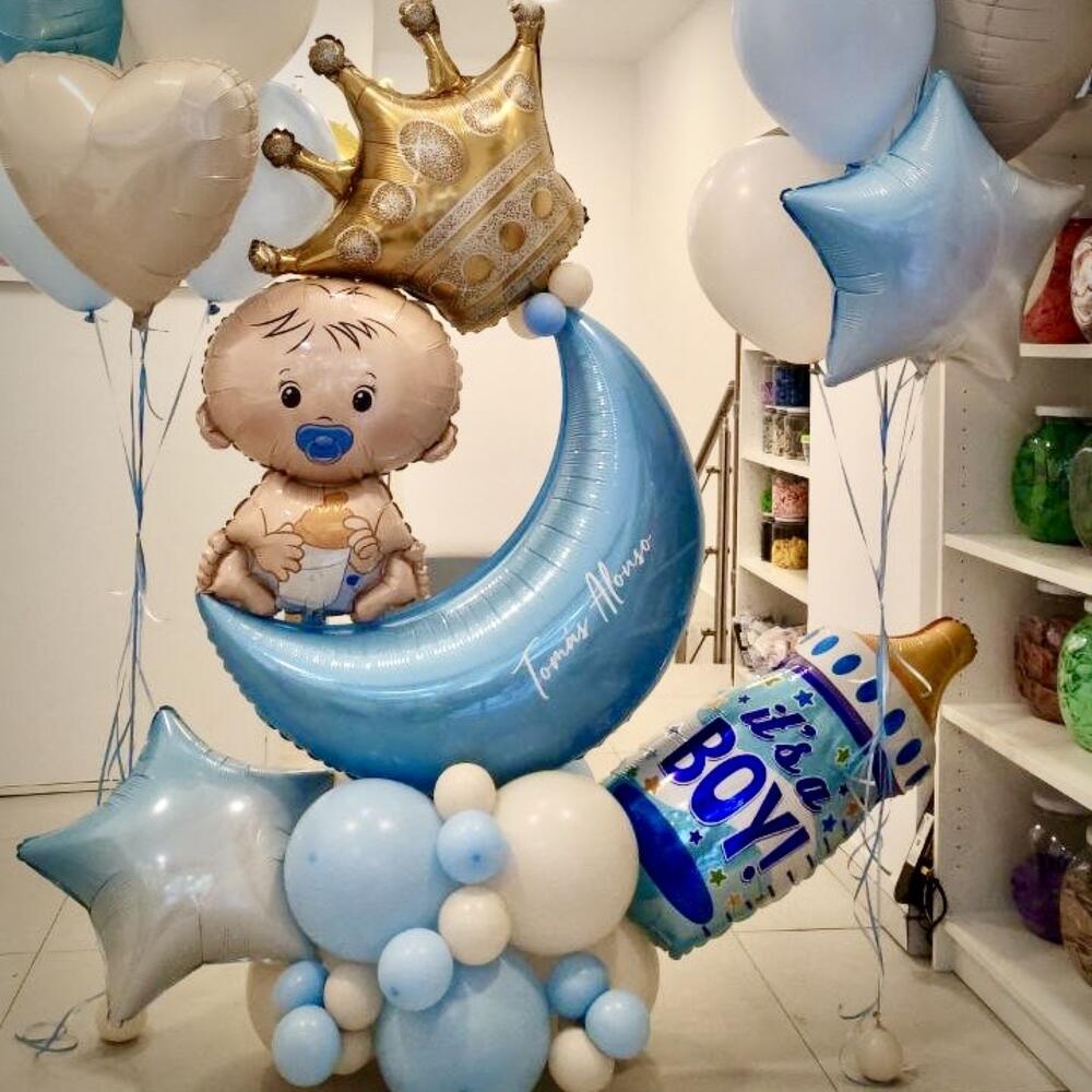 —Підставка для латексних кульок, матово-блакитний, бежевий — 1 шт. —Кулька у формі місяця, 88x62 см, матово-блакитний — 1 шт. —Кулька у формі немовляти, 67x46 см, матово-блакитний — 1 шт. —Кулька у формі зірки, 45 см, матово-блакитний — 1 шт. —Кулька у формі дитячої пляшечки, 80x43 см, матово-блакитний — 1 шт. —Кулька у формі корони, золота — 1 шт. 2 букети з гелієвих кульок —Кулька у формі зірки, 45 см, матово-блакитний, білий, бежевий — 2 шт. —Кулька у формі серця, наповнена гелієм, 45 см, матово-блакитний, білий, бежевий — 2 шт. —Латексні кульки, наповнені гелієм, 12 (30 см), матово-блакитний, білий, бежевий — 8 шт. —Вага — 2 шт.