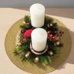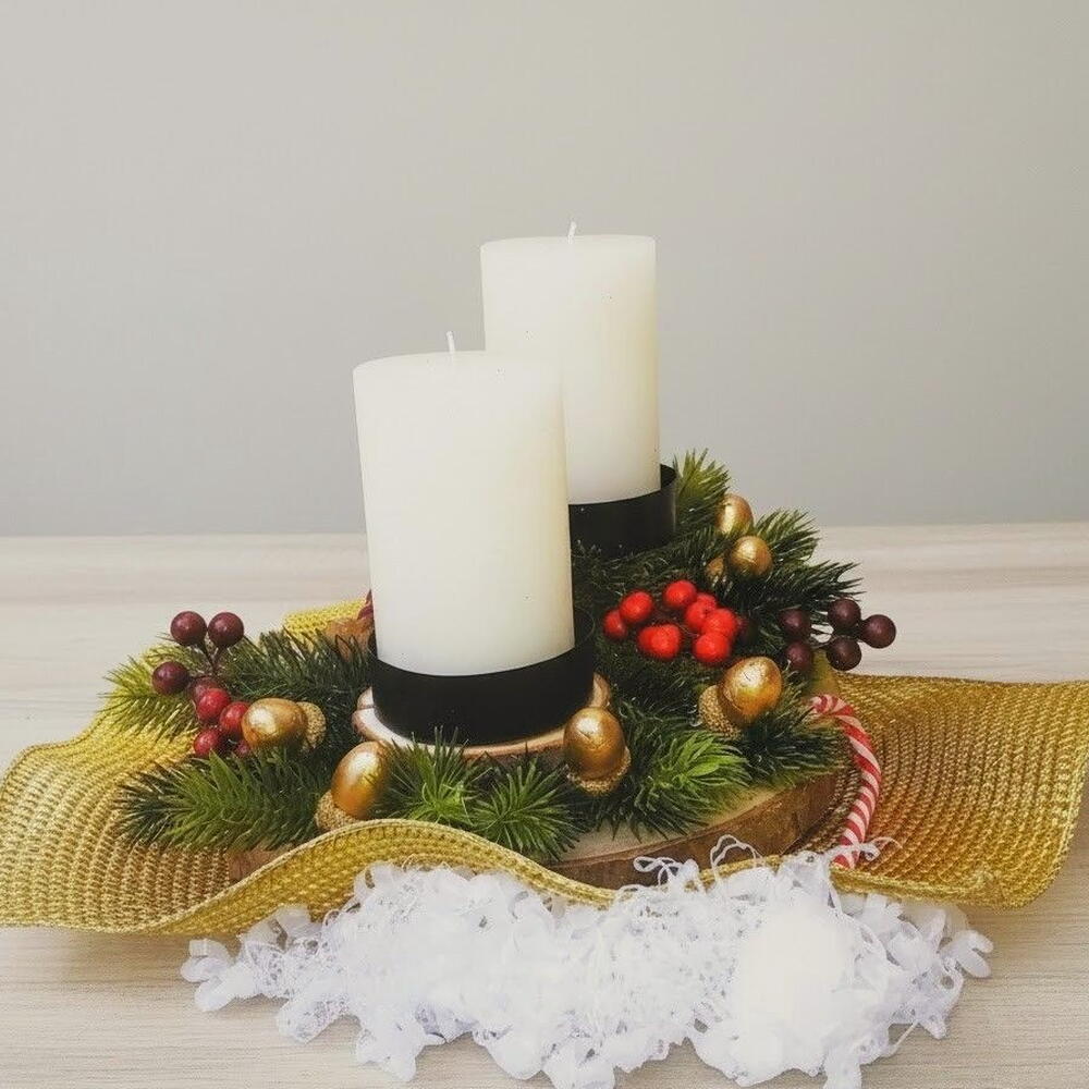 Цей елегантний різдвяний центр додає теплу та святкову атмосферу будь-якому столу. Поєднання двох білих циліндричних свічок із вінком із зелених гілок створює гармонійну та природну атмосферу. Декоративні деталі, такі як маленькі шишки, червоні ягідки та золотисті жолуді, додають класичну нотку, властиву цьому сезону. Дерев'яні диски в основі кожної свічки надають рустикального вигляду, що підкреслює майстерну красу композиції. Ідеально підходить як центральний елемент для святкових вечерь або як декор для дому протягом усього різдвяного періоду. Для догляду рекомендується тримати центр подалі від прямих джерел тепла, уникати протягів і ніколи не залишати свічки запаленими без нагляду. Також рекомендується видаляти пил із гілок сухою тканиною, щоб зберегти їхню візуальну свіжість.