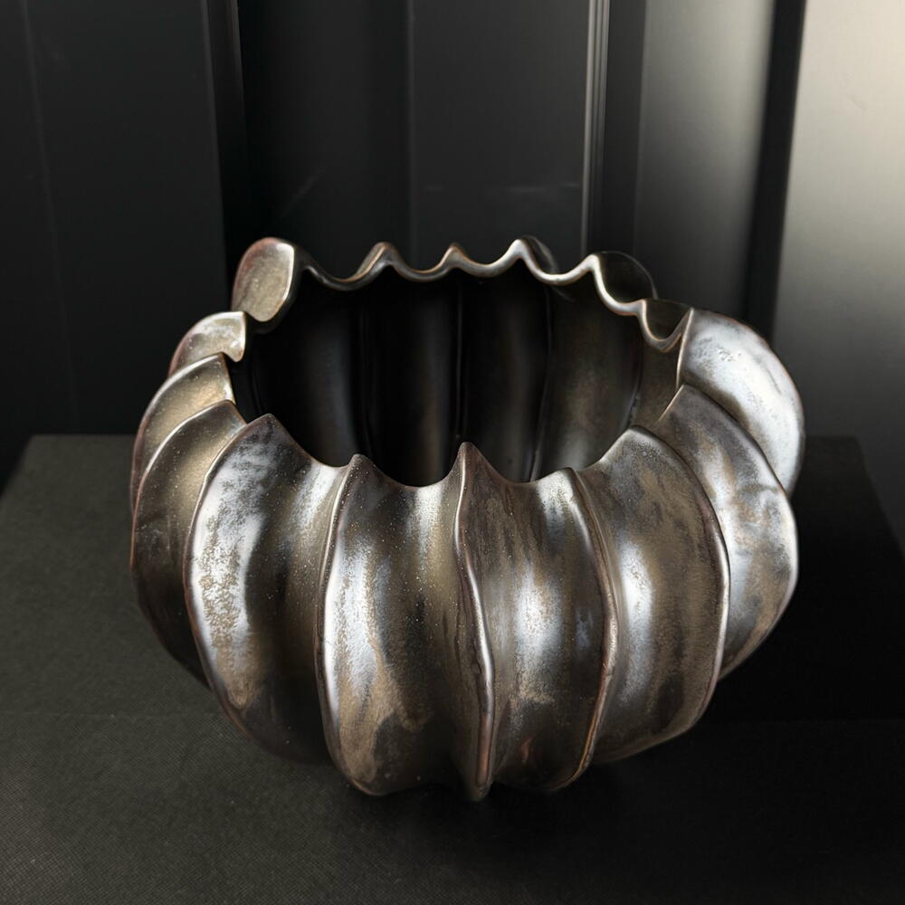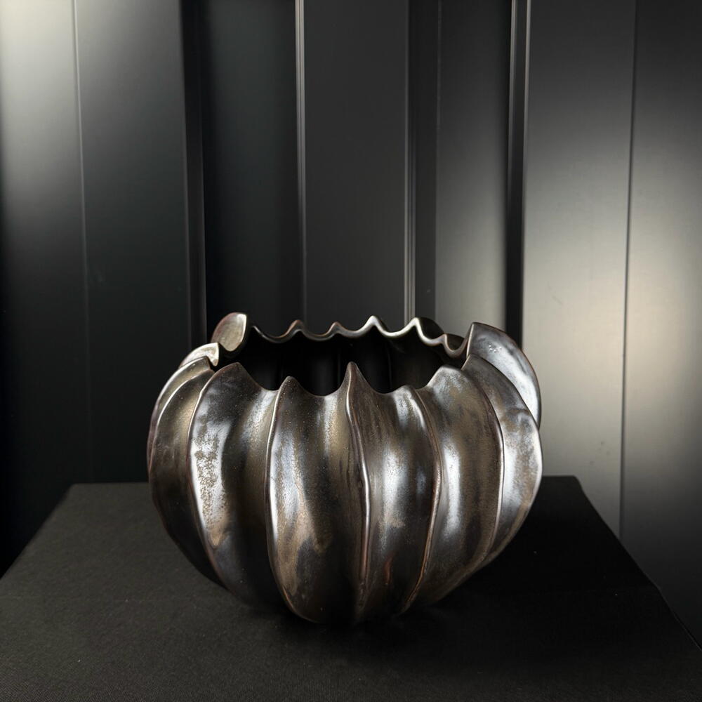 Jarrón decorativo de cerámica con forma orgánica y acabado metálico envejecido, elegante y moderno, ideal para decoración interior y arreglos florales.