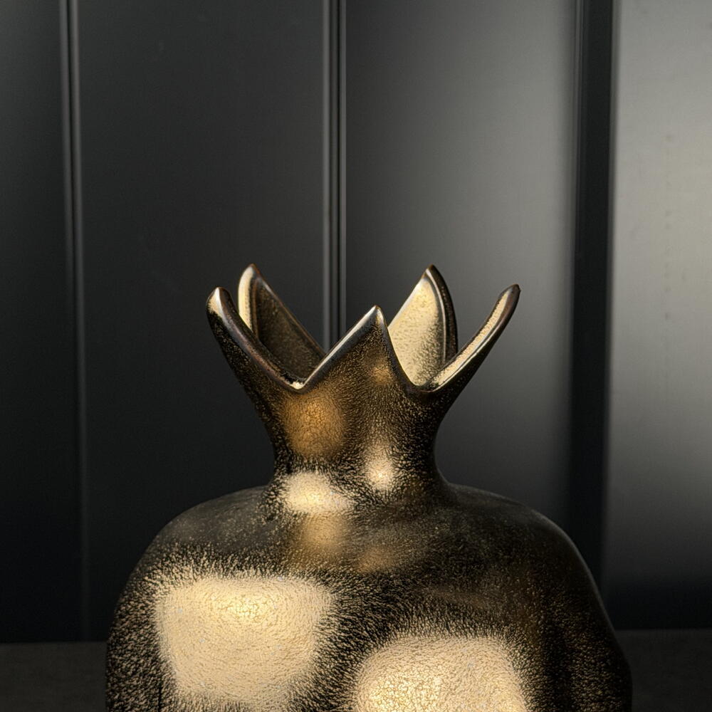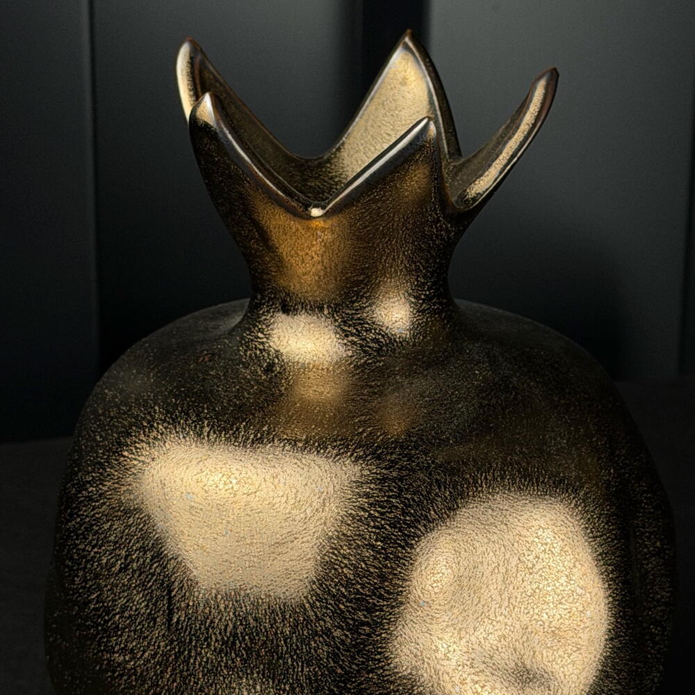 Декоративний скляний гранат із золотистою обробкою. Елегантний виріб із матовою текстурою та тонким блиском, що відбиває світло. Ідеально як декоративний акцент, щоб додати вишуканості та затишку будь-якому простору.
