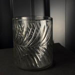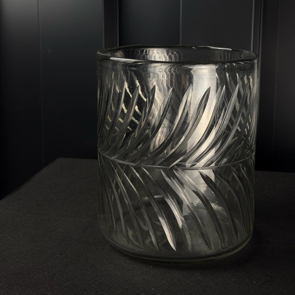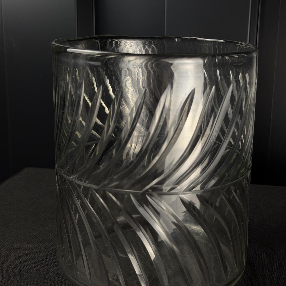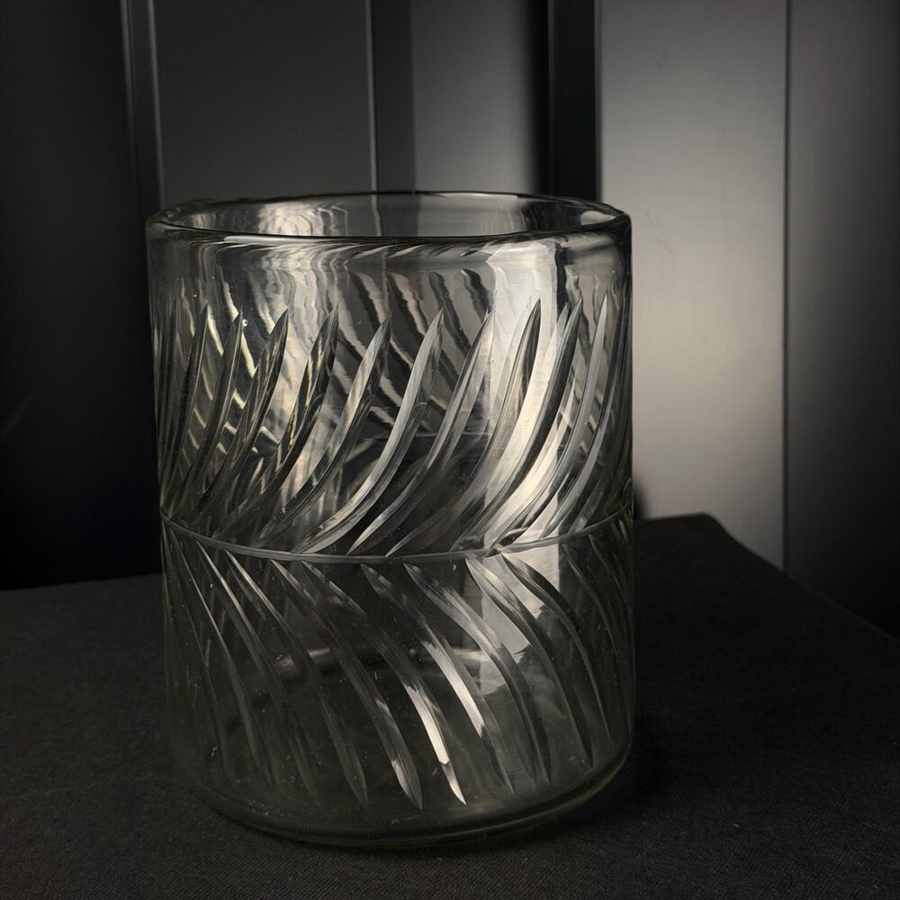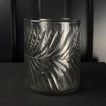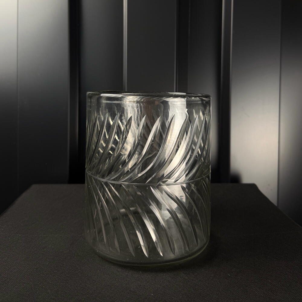 Ваза з різьбленого скла зі спіральним візерунком, елегантна та сучасна, ідеальна для свічок або невеликих квіткових композицій.