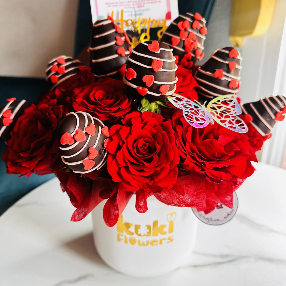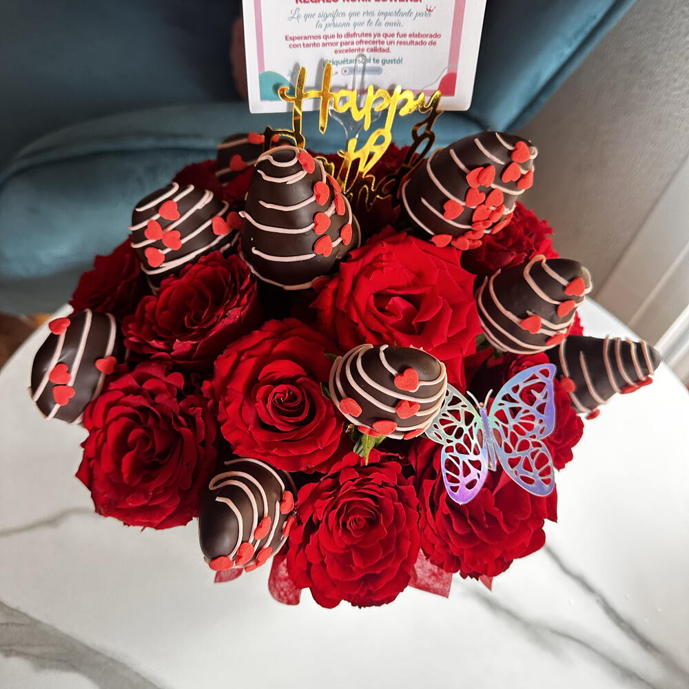 листівка з присвятою - 1 шт. полуниця в шоколаді - 10 шт. міні-троянди - 10 шт.
