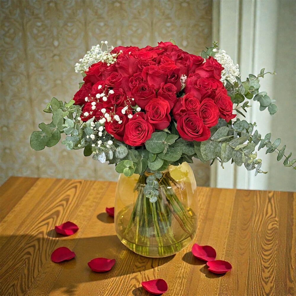 Eucaliptus - 10 шт. paniculata - 5 шт. rosas rojas - 50 шт.