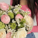 Eucalyptus - 3 шт. рожевий ранункулюс - 5 шт. white roses - 6 шт. green viburnum (snowball) - 4 шт.