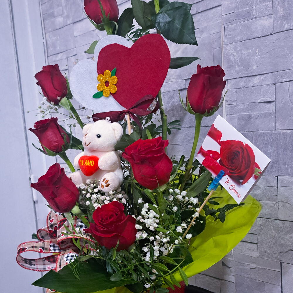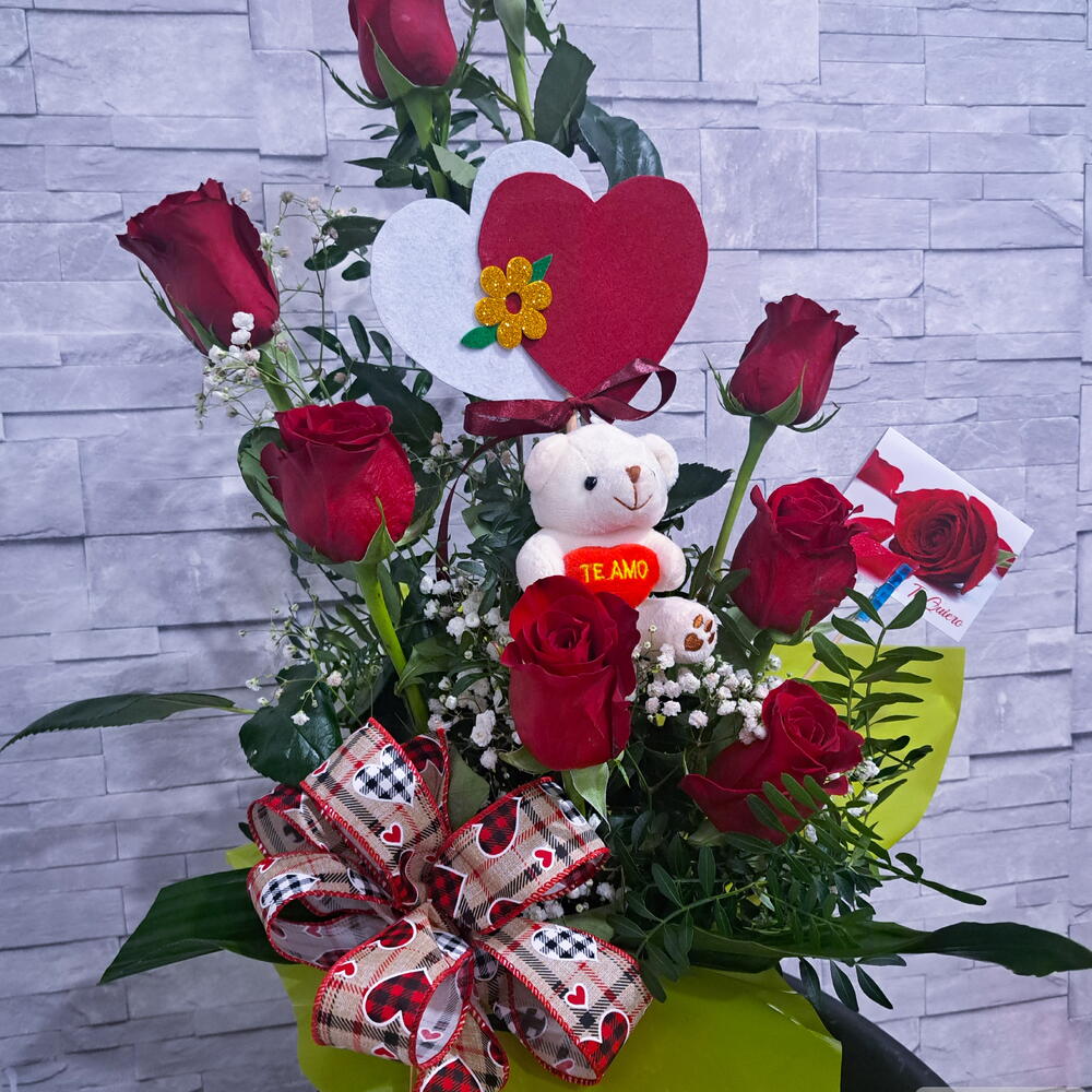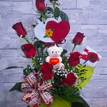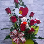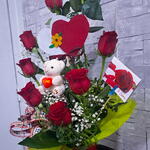 Цей прекрасний квітковий центр включає привабливу комбінацію з 8 яскравих червоних троянд, доповнену 3 елегантними сезонними гілочками зелені та 2 одиницями ніжної гіпсофіли. Усе це влаштовано на елегантній керамічній основі. Центральну композицію прикрашає милий ведмедик і значок у вигляді сердечок, що робить її ідеальним подарунком для особливих випадків або просто для прикрашання вашого дому з ноткою любові та краси.
