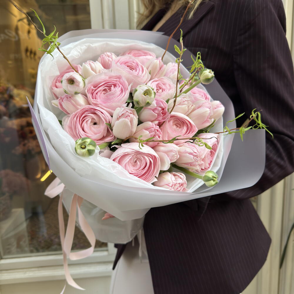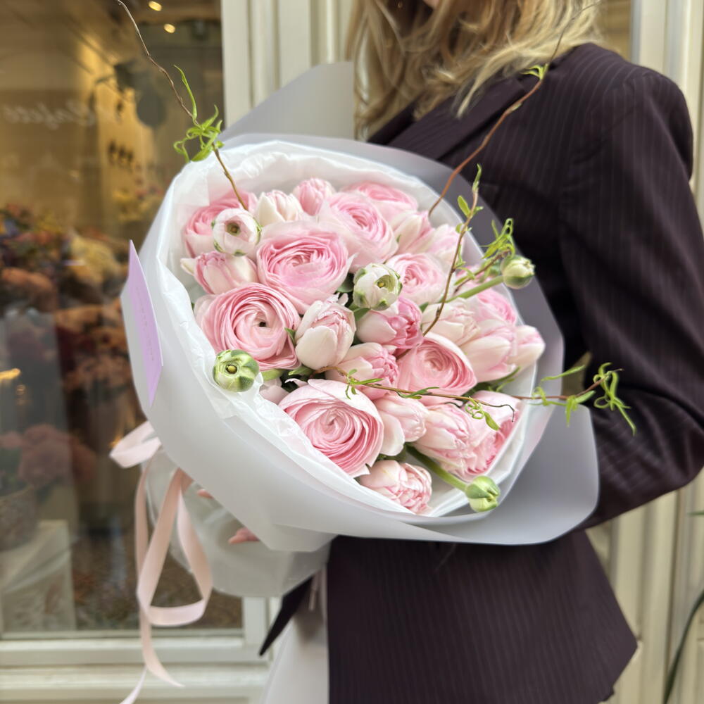 salix stick - 3 шт. tulips pink double - 21 шт. ranúnculos hanoi rose - 9 шт.