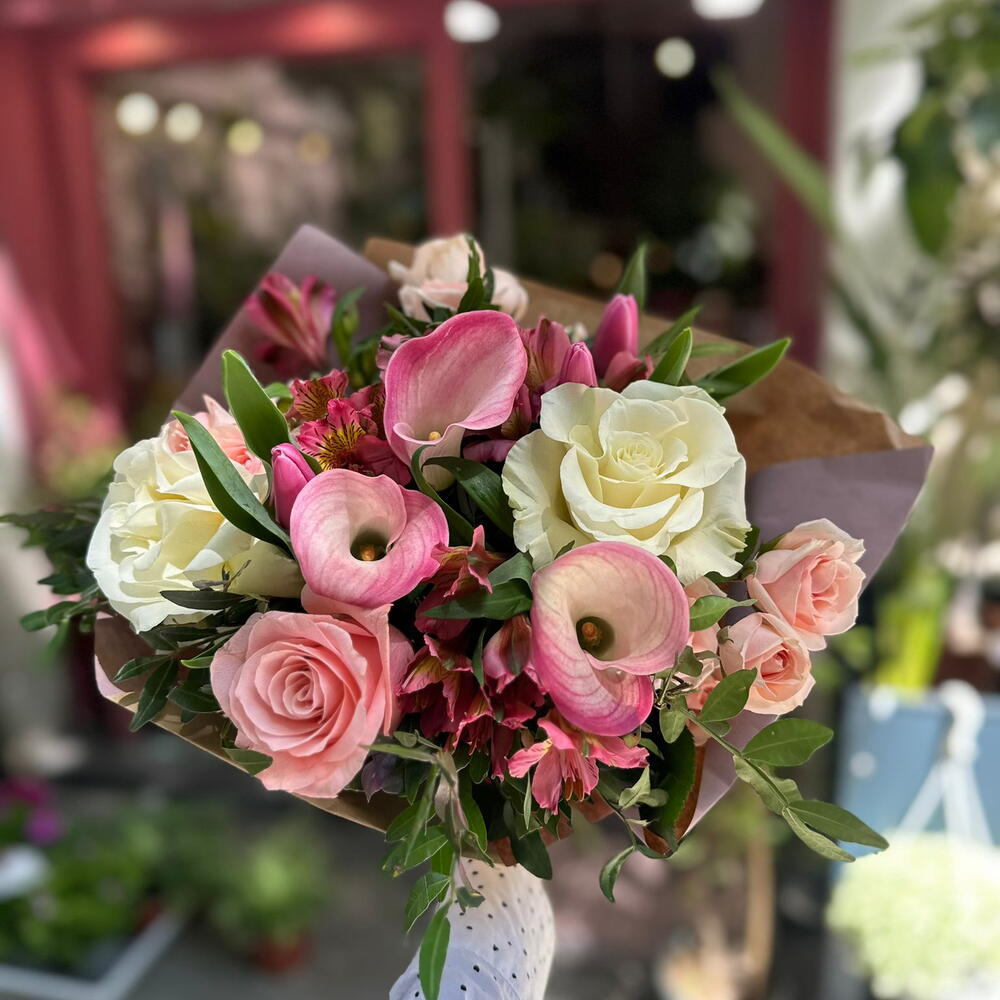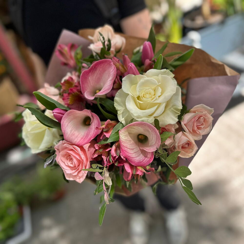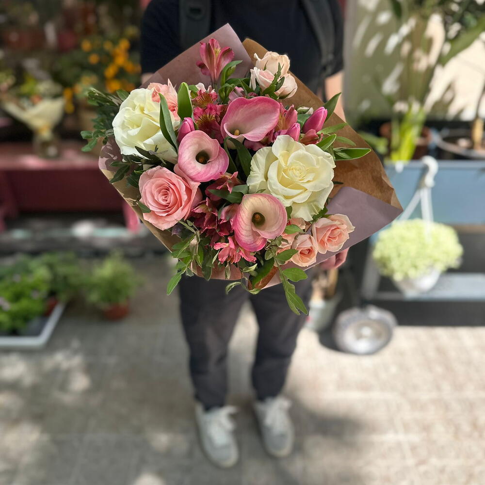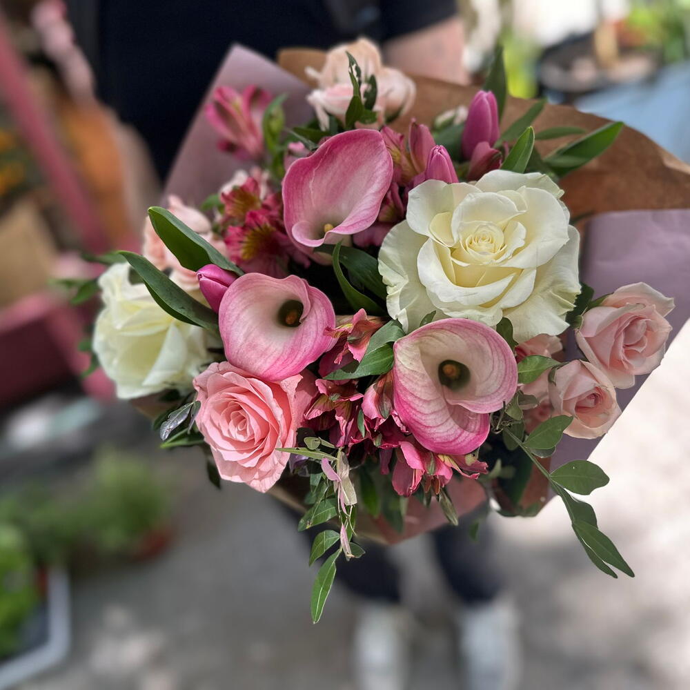 Ніжна та елегантна композиція, що поєднує м'якість з вишуканою структурою. Цей букет, що містить витончені калли, романтичні французькі троянди та повітряні кущові троянди, чудово доповнюється ніжним шармом альстромерії. Свіжа зелень лентіско додає природного, текстурованого штриха, підкреслюючи легкість та глибину букету. Blush Harmony ідеально підходить для вираження ніжності, захоплення та невимушеної вишуканості.