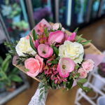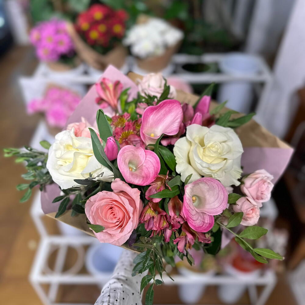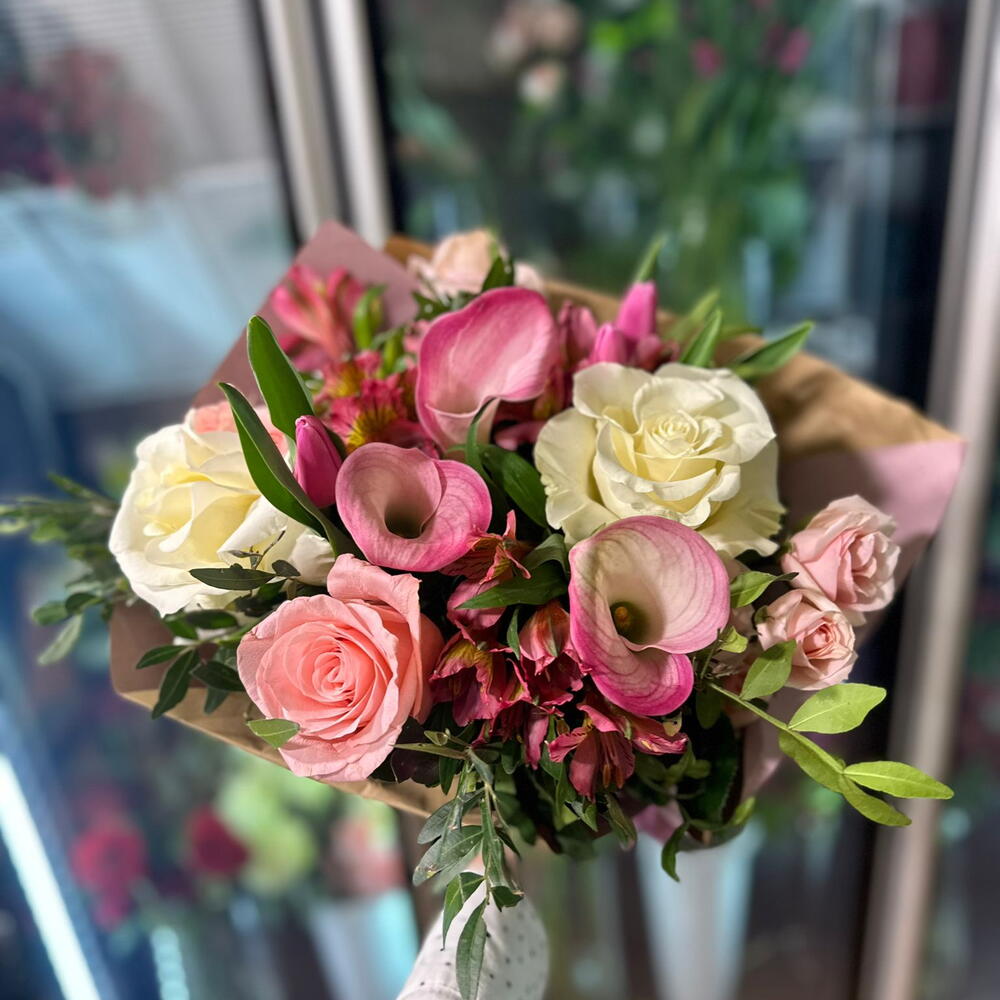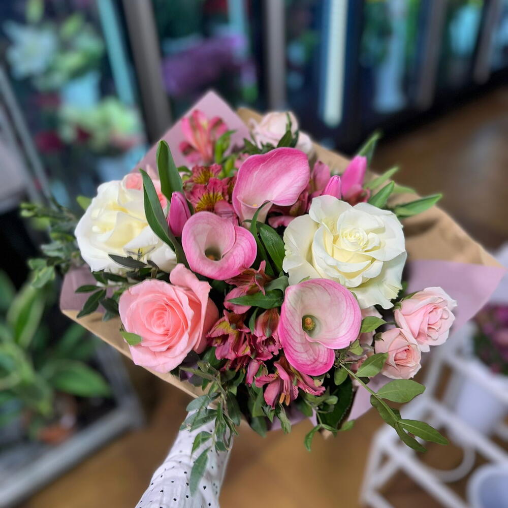 Ніжна та елегантна композиція, що поєднує м'якість з вишуканою структурою. Цей букет, що містить витончені калли, романтичні французькі троянди та повітряні кущові троянди, чудово доповнюється ніжним шармом альстромерії. Свіжа зелень лентіско додає природного, текстурованого штриха, підкреслюючи легкість та глибину букету. Blush Harmony ідеально підходить для вираження ніжності, захоплення та невимушеної вишуканості.