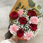 Цей вишуканий букет поєднує пристрасть червоних троянд із ніжністю рожевих гвоздик, підкреслену делікатністю гіпсофіли та елегантним зеленим акцентом евкаліпта. Ідеально підходить, щоб висловити любов, захоплення або вдячність, це квіткове аранжування передає суть краси й романтики. Ідеально для особливих подій, таких як річниці, дні народження або просто щоб підняти комусь настрій. Завдяки подачі в золотому обгортанні воно передає витонченість і турботу в кожній деталі. Подаруйте незабутній момент цим приголомшливим букетом свіжих квітів!