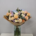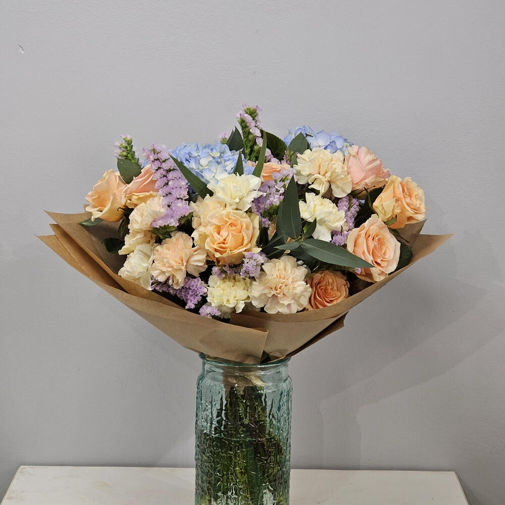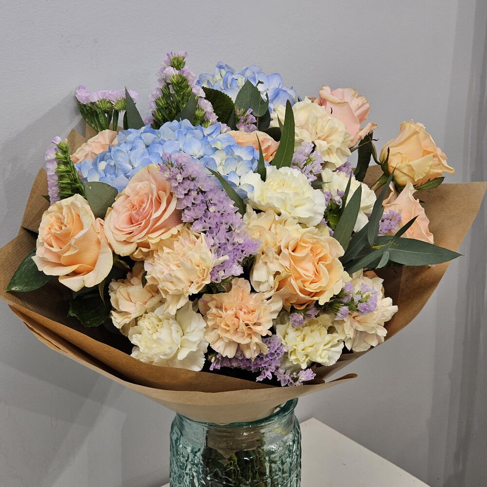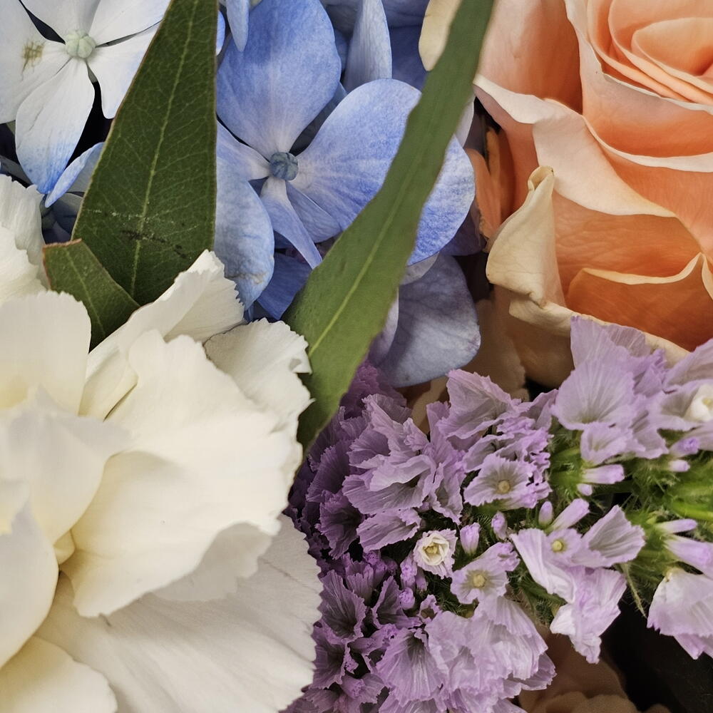 Букет, сповнений гармонії та свіжості, що поєднує в собі ніжні пастельні тони. З ніжними персиковими трояндами, кремовими гвоздиками, блакитними гортензіями та акцентами бузку, ця композиція ідеально підходить для передачі спокою та ніжності. Зелене листя додає свіжого контрасту, що підкреслює природну красу дизайну. Ідеально підходить для особливих випадків, таких як річниці, весілля або просто для того, щоб зробити день коханої людини яскравішим. Рекомендований догляд: Зріжте стебла під кутом, перш ніж поставити букет у вазу зі свіжою водою. Міняйте воду кожні два дні та тримайте букет у прохолодному місці, подалі від протягів та прямих сонячних променів. Цей букет – насолода для почуттів!