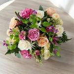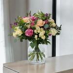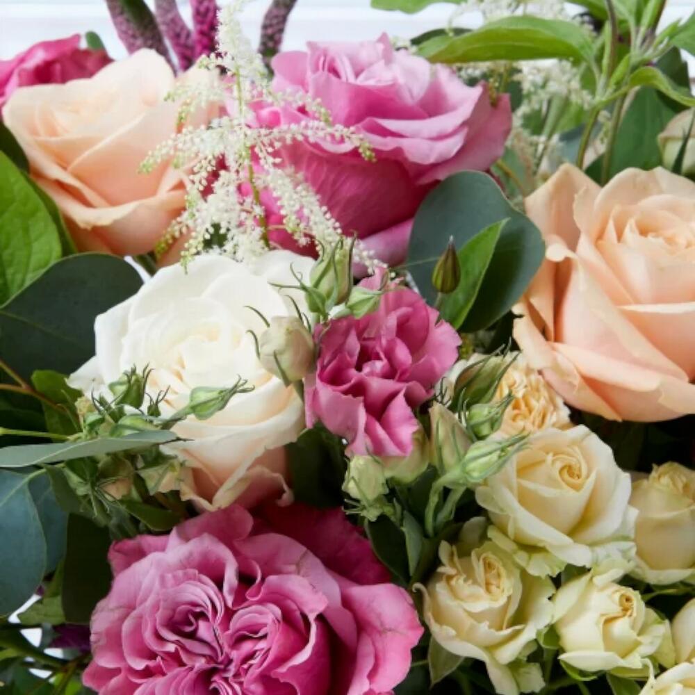 Цей вишуканий букет поєднує елегантність троянд у відтінках фіолетового, персикового та білого з ніжністю розгалужених троянд, клематису, астильби, лізіантуса та вероніки. Свіжа зелень додає природного і гармонійного акценту, створюючи яскравий та вишуканий флористичний дизайн. Ідеально підходить для особливих випадків або для прикраси будь-якого простору, цей букет передає свіжість і елегантність. Щоб зберегти свіжість цього букету, обріжте стебла під кутом перед тим, як поставити їх у вазу з чистою водою. Змінюйте воду кожні два дні і додавайте флористичний консервант, якщо він доступний. Помістіть букет у прохолодне місце, подалі від прямих сонячних променів та протягів, щоб продовжити його красу і життєздатність.