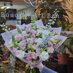 Statice - 5 шт. Alstroemeria - 9 шт. hortensia - 1 шт. craft paper - 2 шт. antirrinum - 4 шт. delphinium - 3 шт. rosa - 7 шт. стебла евкаліпта - 5 шт. лентіско - 3 шт. мікс гвоздик - 7 шт.