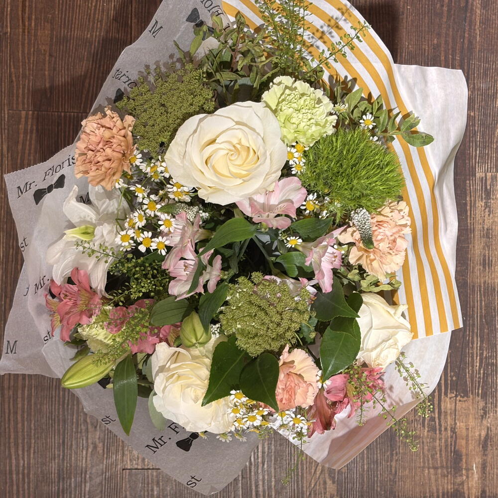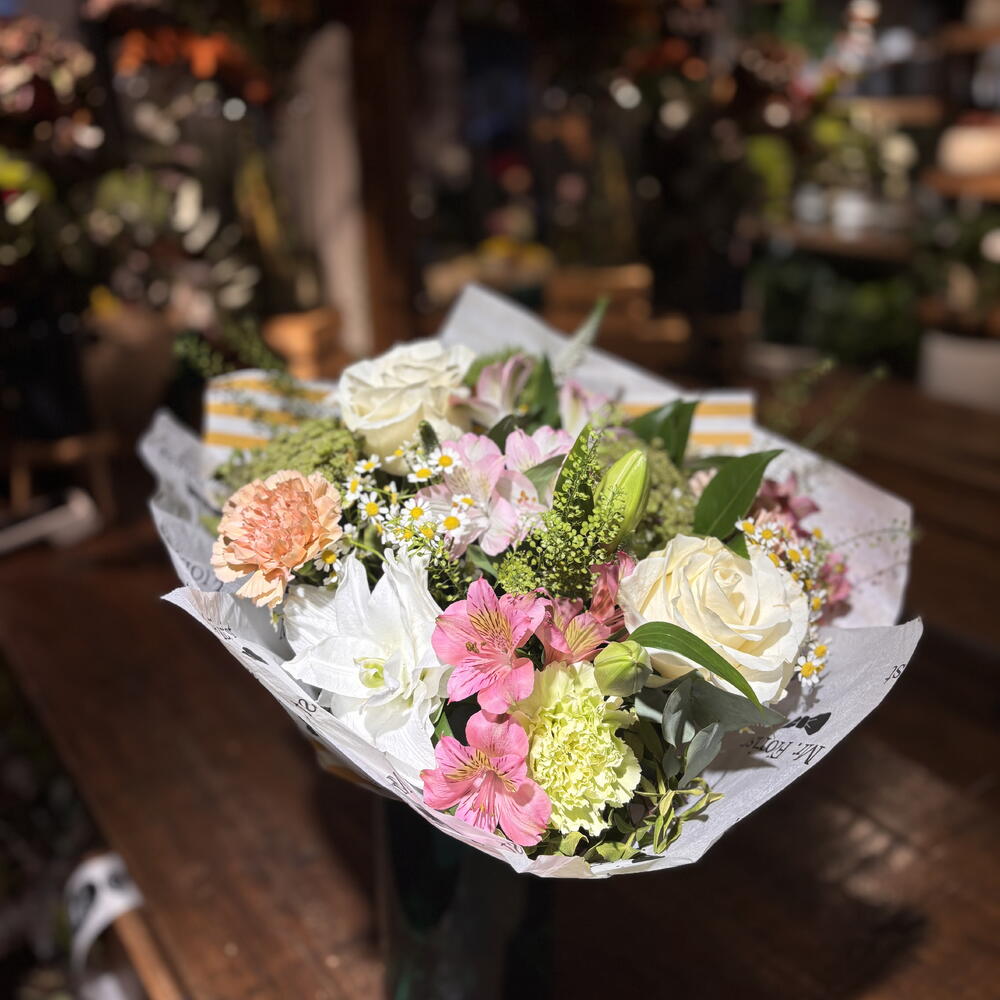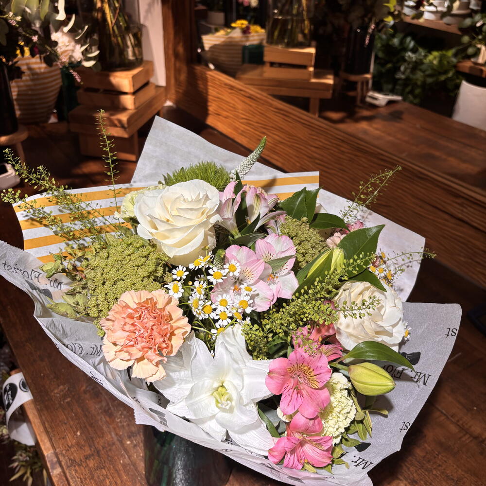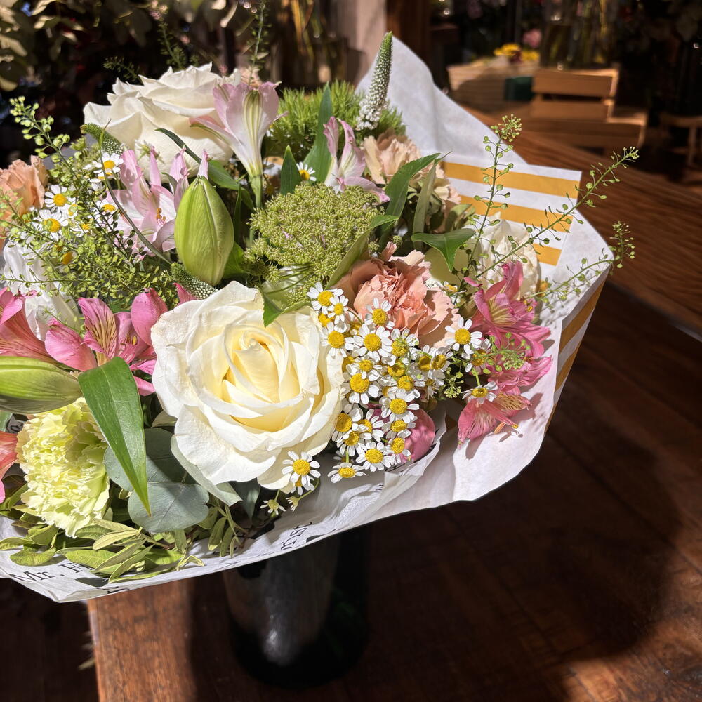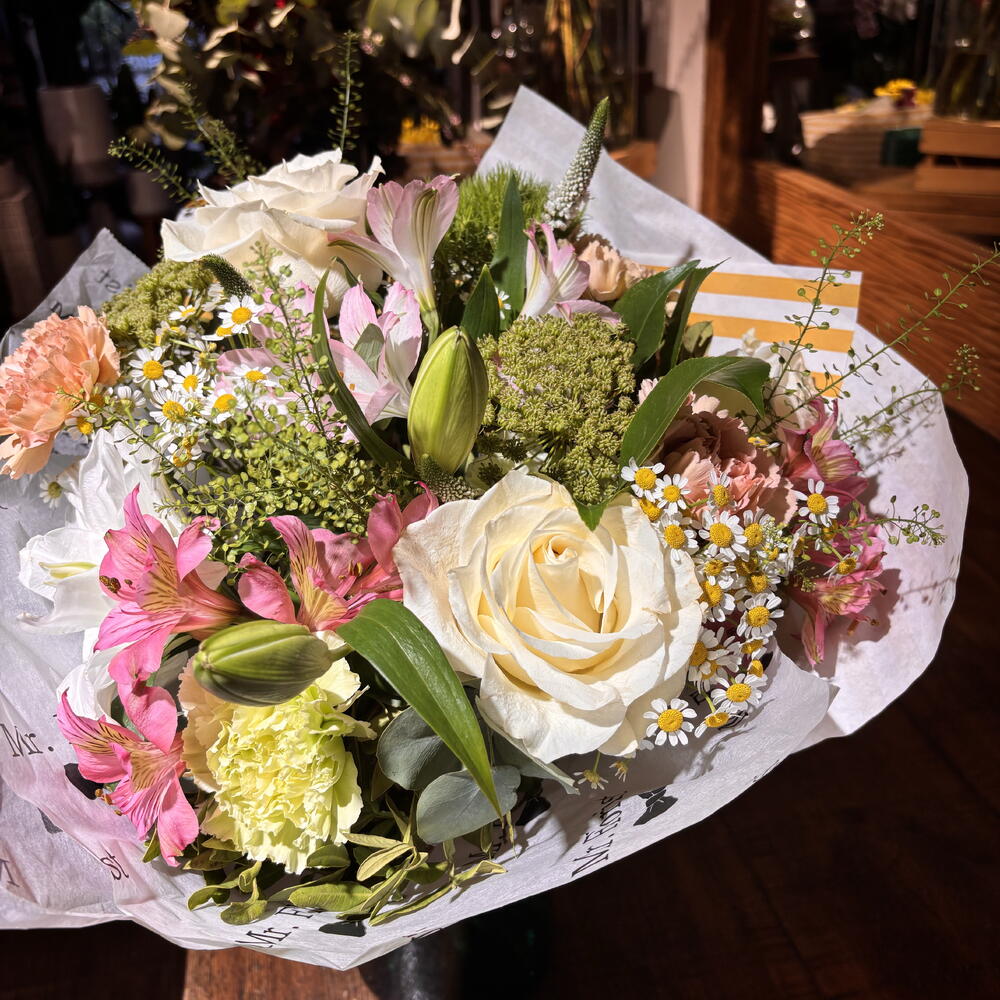 Яскравий та чарівний букет, що поєднує ніжність та природну свіжість. Ніжні кремові троянди змішуються з рожевими та білими квітами, створюючи гармонійну та життєрадісну композицію. Невеликі квіткові акценти та свіжа зелень додають легкості та нотку дикої природи. Різноманітність текстур надає глибини та природного вигляду, ніби щойно зібрані в саду. Елегантно загорнутий, цей букет передає тепло та гарний смак. Ідеально підходить для днів народження, подяки чи особливих подій. Ідеальний вибір для вираження прихильності, радості та щирих емоцій.