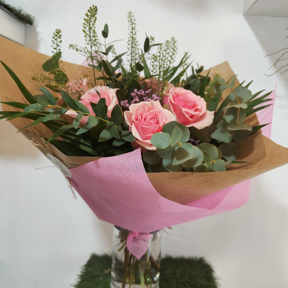phalaris - 2 шт. Евкаліпт стегенеа - 4 шт. подовжені листки - 3 шт. букет троянд - 5 шт. limomi - 2 шт.
