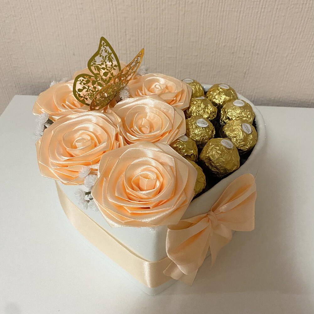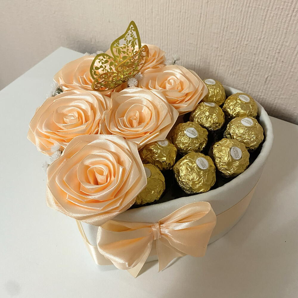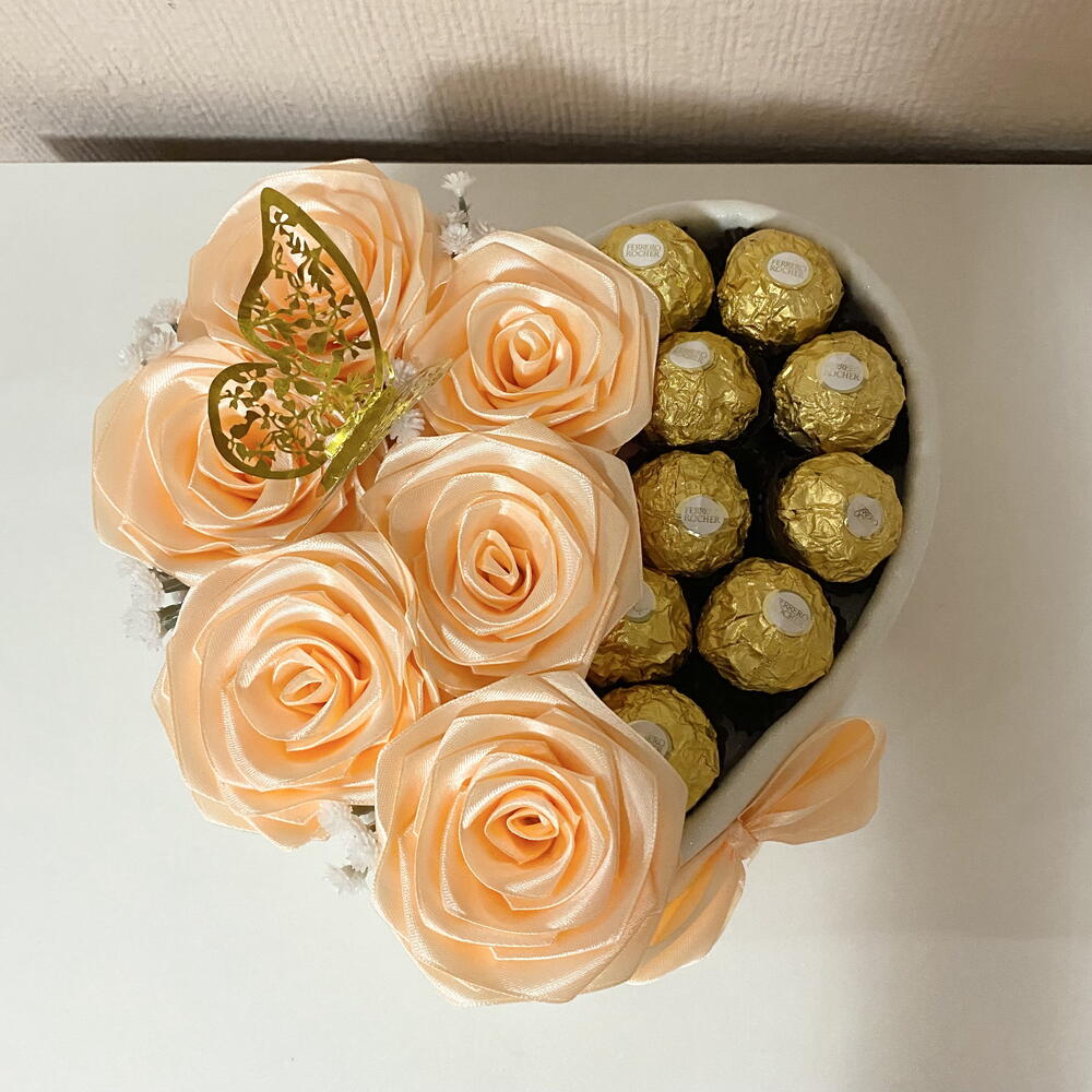 Ferrero rocher - 9 шт. коробка у формі серця - 1 шт. декоративний метелик - 1 шт. вічні троянди - 6 шт. невеликі білі штучні квіти - 4 шт.