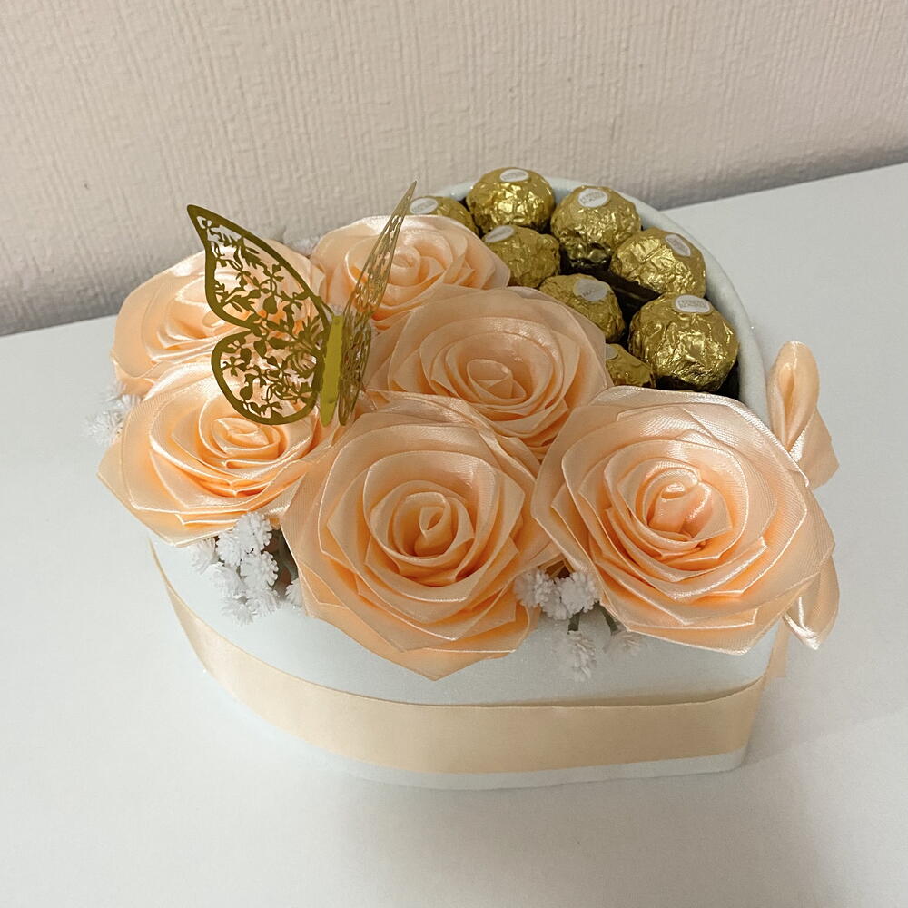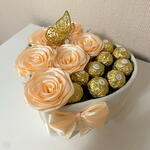 Шовковиста, блискуча троянда, яка ніколи не в'яне – символ вічних почуттів Солодкий та щирий подарунок, який здивує елегантністю. Воістину унікальний подарунок! Шість атласних троянд персикового кольору ручної роботи в поєднанні з дев'ятьма шоколадними цукерками Ferrero Rocher створюють елегантну та візуально приголомшливу композицію. Ідеально підходить для того, щоб здивувати: - друга - колегу чи колегу по роботі - маму - або будь-яку особливу людину красивим та люблячим жестом Включає дев'ять високоякісних шоколадних цукерок Ferrero Rocher. Склад: молочний шоколад, фундук, цукор, рослинна олія (пальмова), пшеничне борошно, молочні продукти, какао-порошок, соєвий лецитин, розпушувач, сіль та ароматизатори. Алергени: молоко, фундук, глютен та соя.
