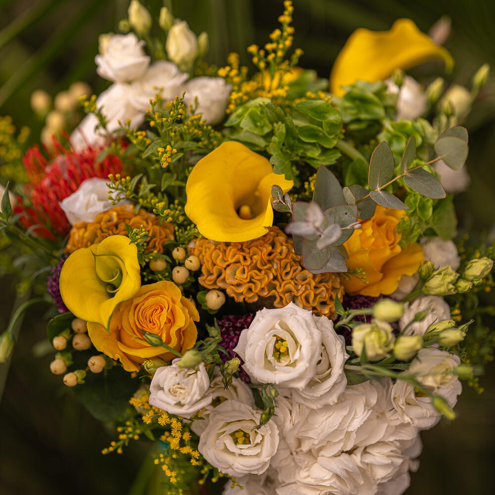 Lisianthus - 5 шт. протея - 1 шт. целозії - 3 шт. гіперікум - 5 шт. білі гортензії - 1 шт.