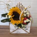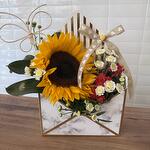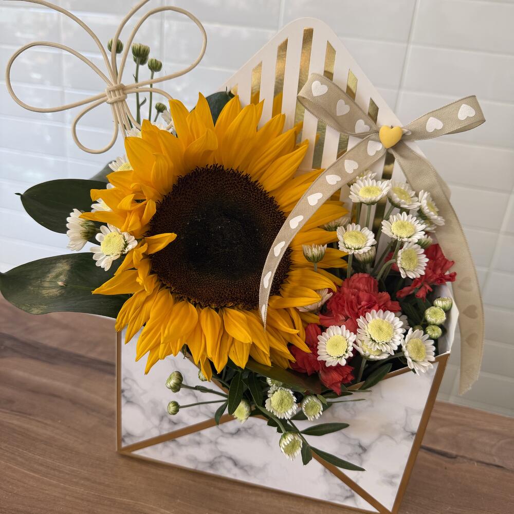 girasol - 1 шт. гвоздичка - 2 шт. різні зелені - 3 шт. декоративні елементи - 2 шт. міні маргаритки multiflor - 2 шт. коробка листівка - 1 шт.