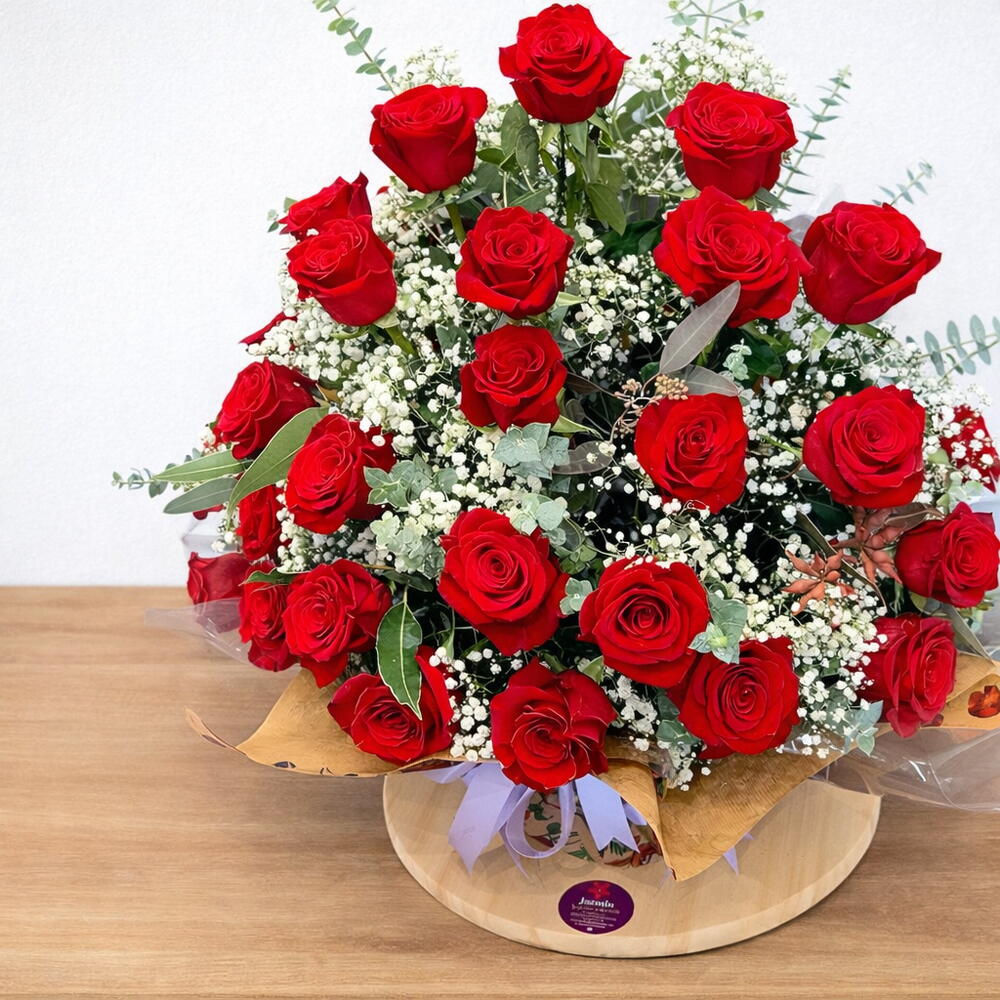 Ця чудова квіткова композиція вирізняється яскравим поєднанням 25 рожевих та 25 червоних троянд, доповнених 10 штиль різноманітної зелені. Крім того, 15 ніжних гіпсофілових лоз вплетені по всій композиції, надаючи їй додаткової текстури та нотки вишуканості. Ця квіткова композиція випромінює атмосферу елегантності та свіжості, ідеально підходить для додавання нотки кольору та життєвої сили до будь-якого простору. Ідеально підходить для використання на заходах, святкуваннях або просто як подарунок, щоб висловити свою любов чи вдячність.