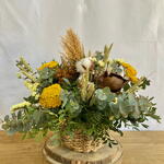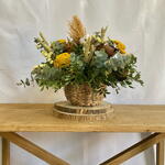 Круглий кошик з натуральної мотузки, діаметром 20 см, виготовлений з мастики, евкаліпта циніарного, перцю чилі, жовтої статиці, консервованої мімози, сушеної натуральної пшениці, пампасної трави, квітки бавовнику та квітки деревини. Розміри з квіткою: 50 см завширшки та 40 см заввишки.