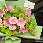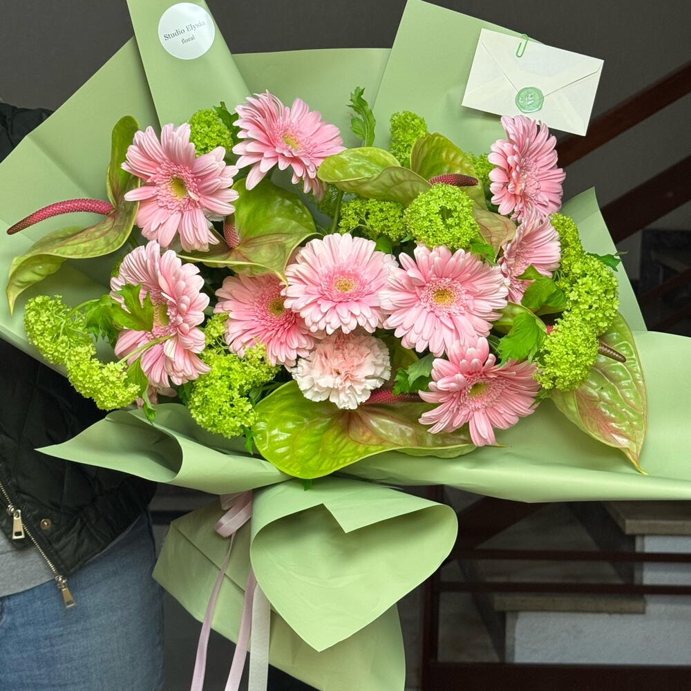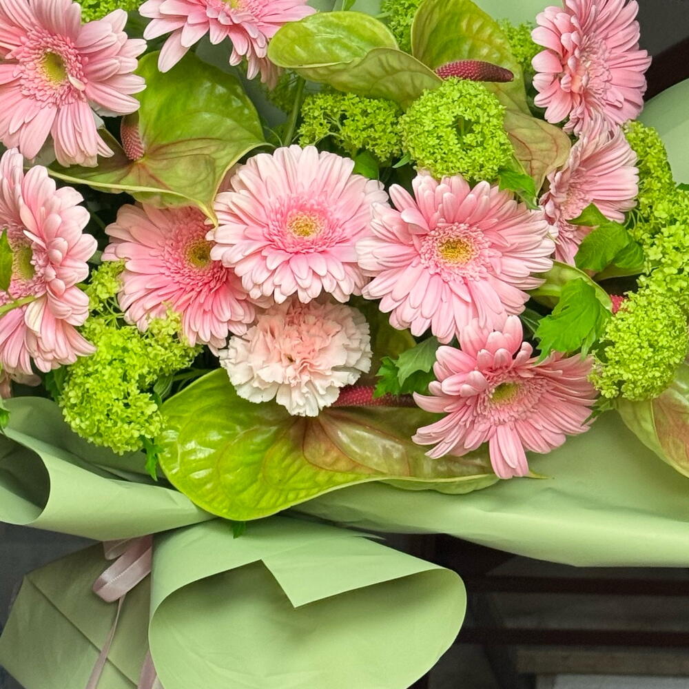 Indulge in the exquisite harmony of soft pink gerberas and luscious vibrunum creating a serene landscape, complemented by an enchanting cluster of green anthuriums. This delightful composition is finished off with a charming trio of dianthus flowers, making it a perfect offering from the Florists Specials. Each bunch consists of 10 radiant pink gerberas, 10 mesmerizing vibrunums, 5 striking green anthuriums, and 3 lovely dianthus. Whether its a special celebration or a simple appreciation of beauty, this arrangement is sure to bring a touch of elegance to any occasion.