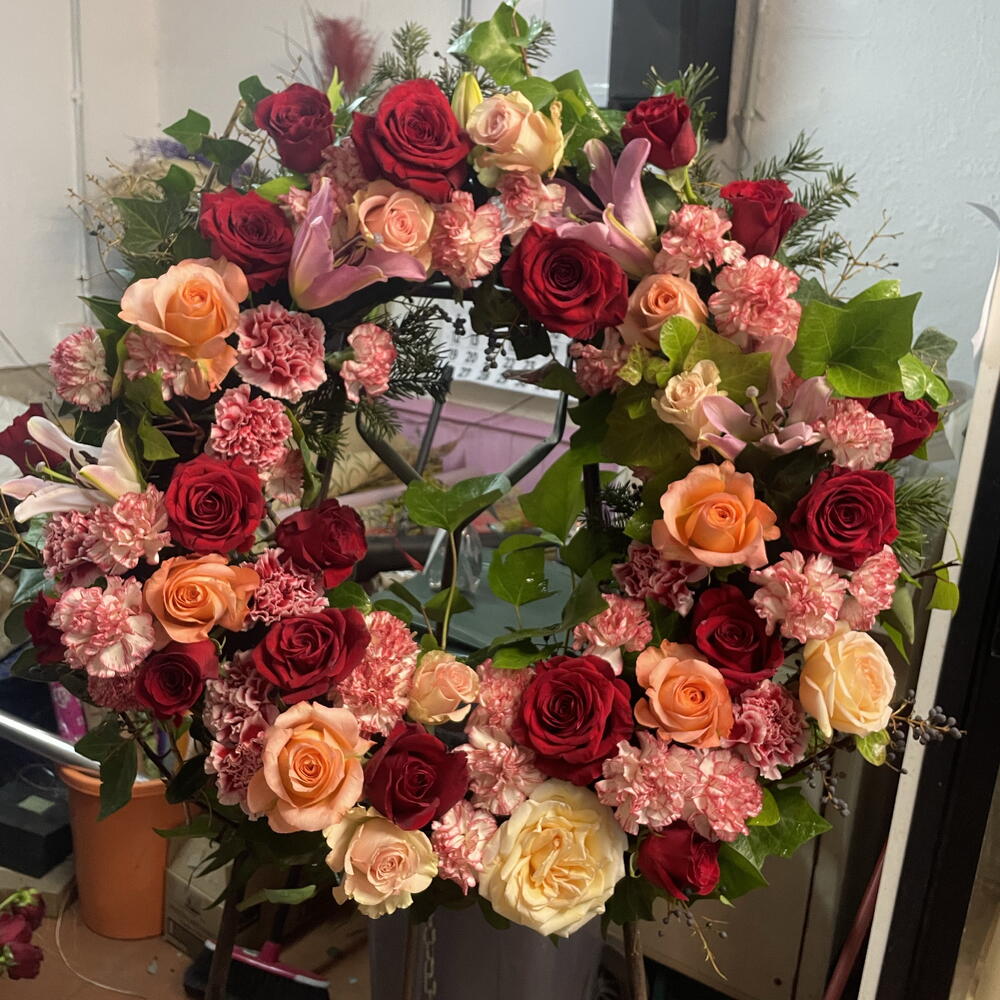 червоні троянди - 20 шт. рожева орієнтальна лілія - 6 шт. rosas melocotón - 6 шт. бурштинова троянда - 15 шт. гвоздики білі/червоні - 30 шт.