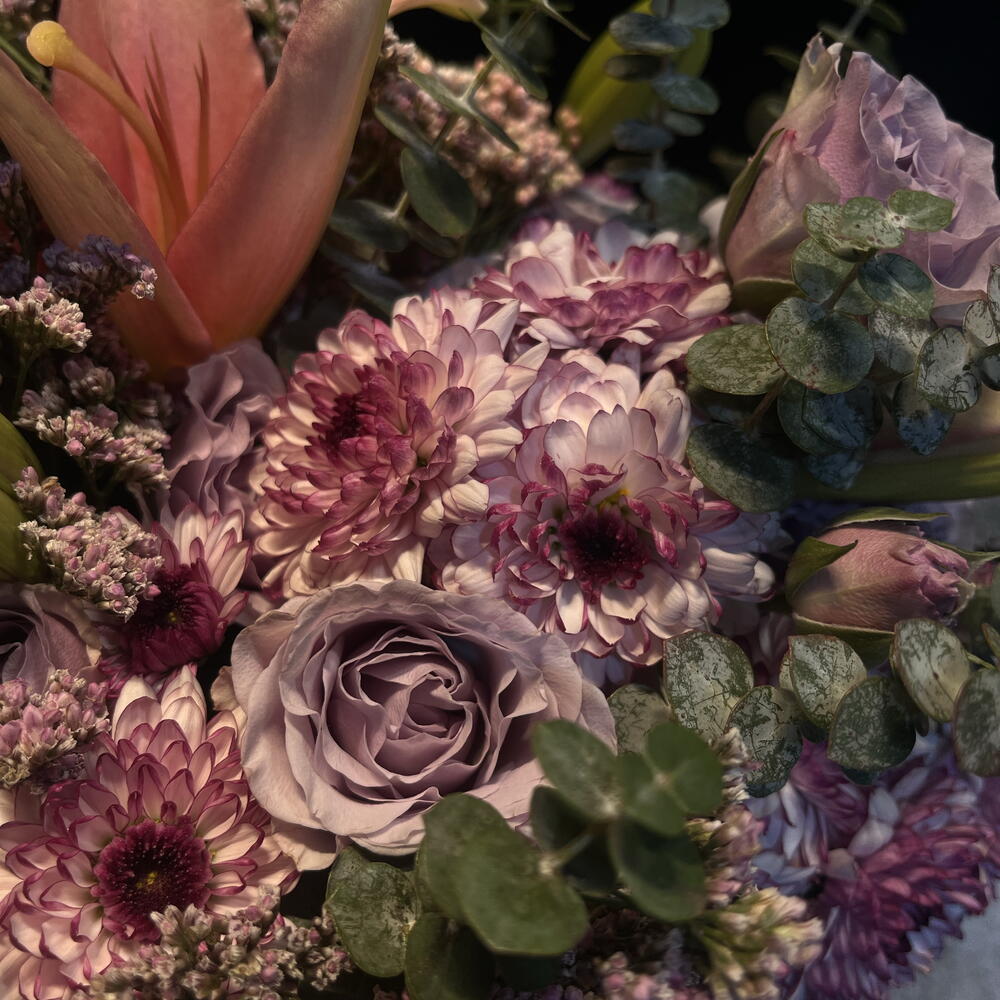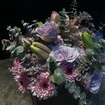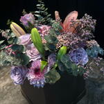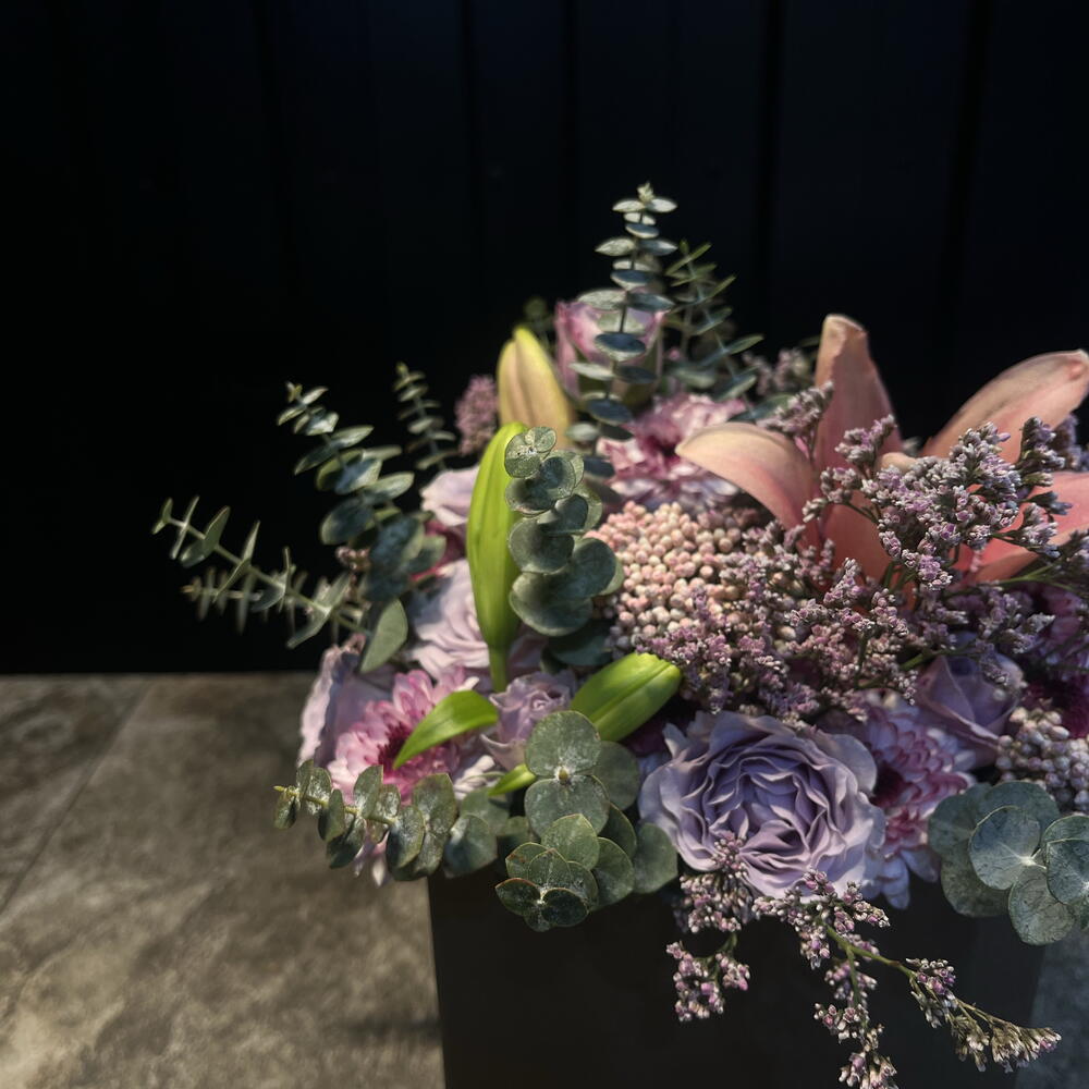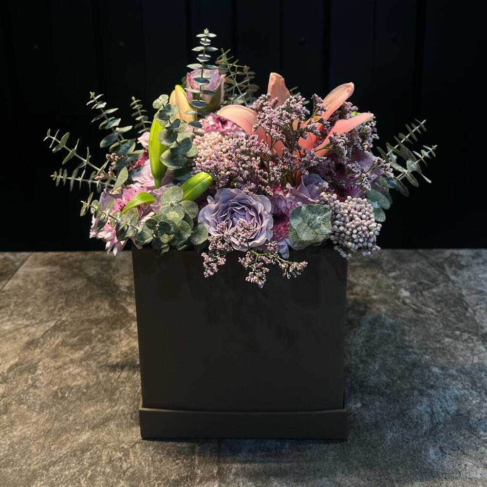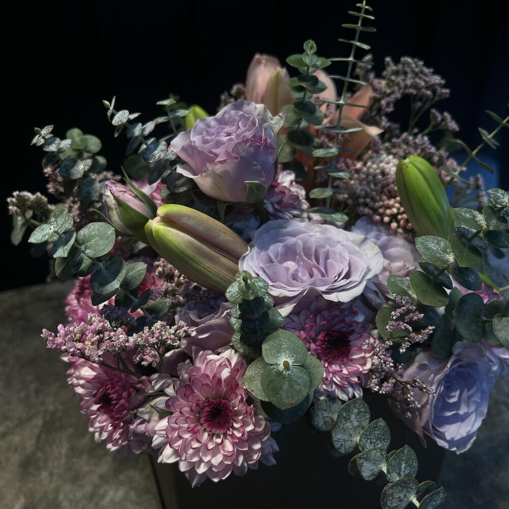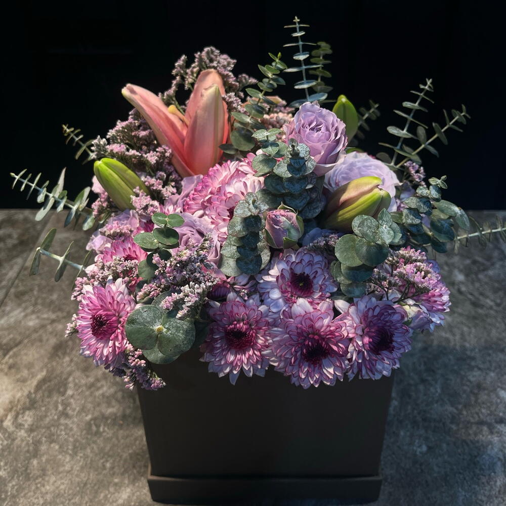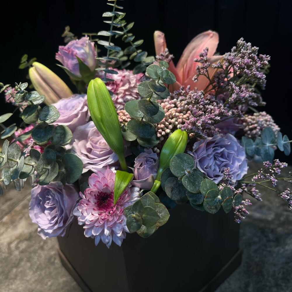 Елегантна та ніжна квіткова композиція в пастельних тонах, представлена в матовій чорній коробці. Поєднує лавандові троянди, рожеві хризантеми, лілію в бутоні і польову квітку, у супроводі евкаліпта, який додає свіжості та текстури. Витончена, м'яка і гармонійна річ, ідеальна, щоб подарувати спокій, ніжність і елегантність.