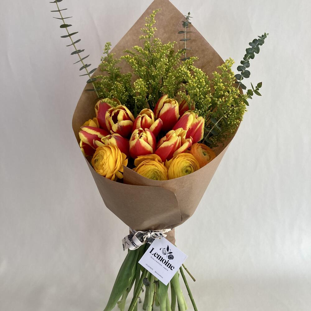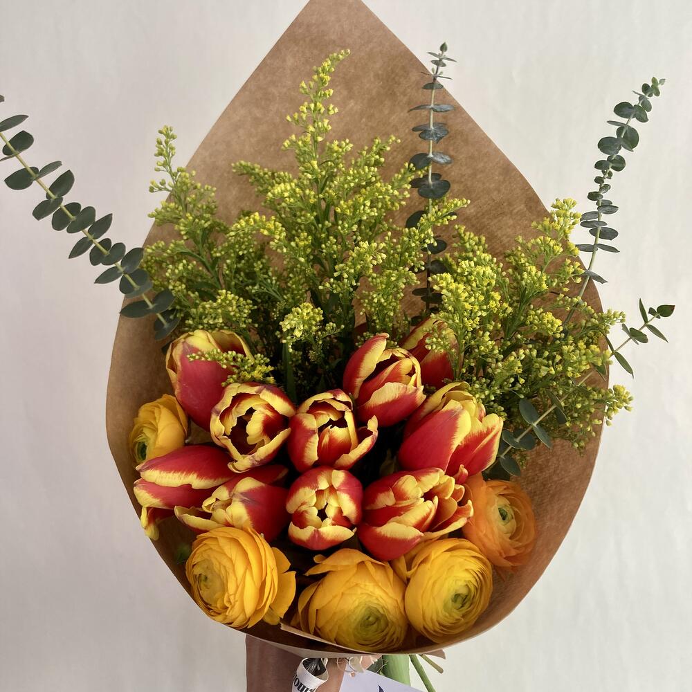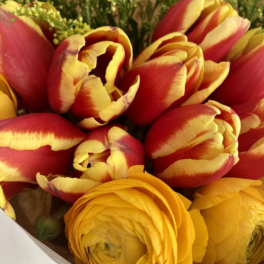 Жовті й червоні тюльпани, поєднані з ніжними ранункулюсами або міні-жовтими трояндами. Це букет, ідеальний для святкування або як радісне послання.
