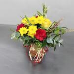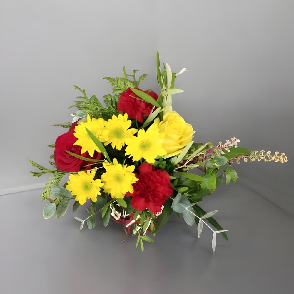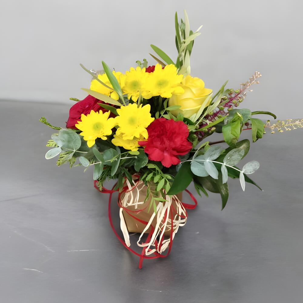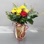 Веселий букет, який поєднує яскраві жовті хризантеми з елегантним контрастом червоних троянд і гвоздик. Свіже листя та зелені акценти додають природного відтінку, що підкреслює життєрадісність квітів. Ідеально підходить для подій, сповнених енергії та радості, цей букет — прекрасний подарунок, щоб підняти настрій або відсвяткувати особливий момент.