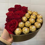 червоні троянди (прибл.) - 9 шт. ферреро роше (прибл.) - 15 шт. коробка у формі серця (різні кольори) - 1 шт.