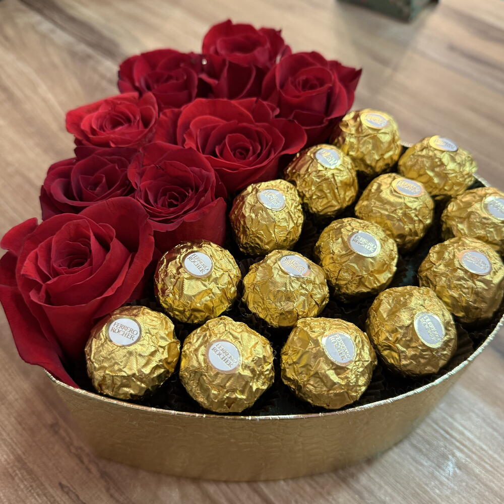 червоні троянди (прибл.) - 9 шт. ферреро роше (прибл.) - 15 шт. коробка у формі серця (різні кольори) - 1 шт.