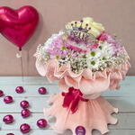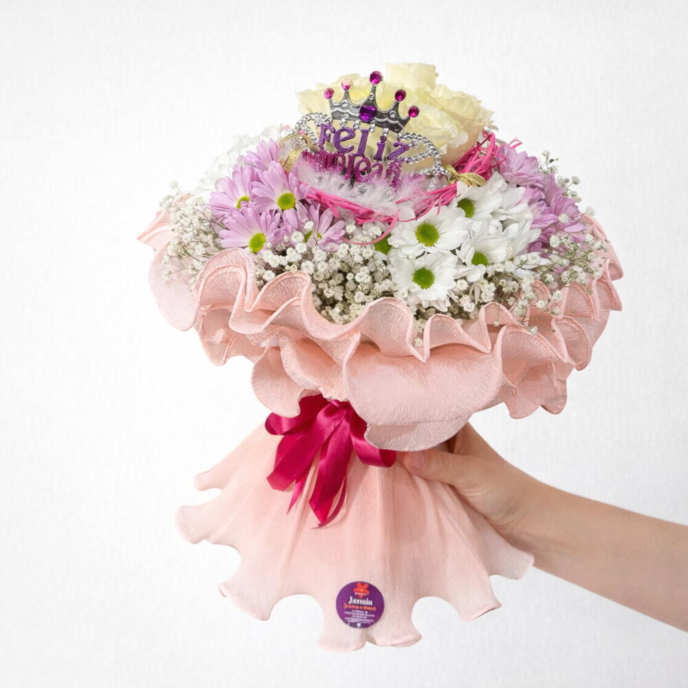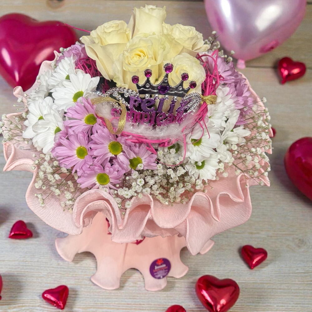 La corona decorativa de “Feliz cumpleaños” convierte este arreglo en el regalo perfecto para sorprender a una persona especial en su día. Un detalle encantador, femenino y lleno de dulzura. 🎀🌸✨