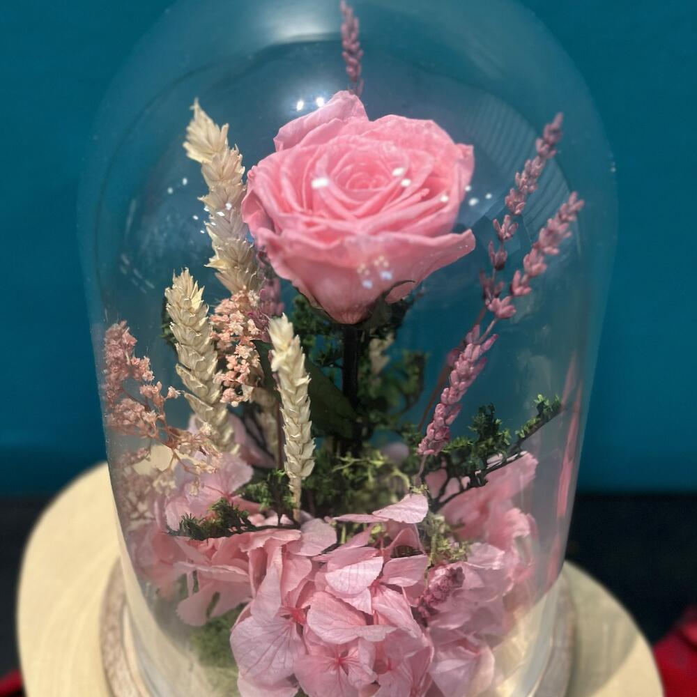 Цей виріб являє собою чудову квіткову композицію, що складається з ретельно відібраної за свою красу консервованої троянди та 10 сухоцвітів. Її шарм та елегантність ідеально підходять для додавання вишуканості та природи будь-якому простору. Зігріваючий серце та довготривалий подарунок.