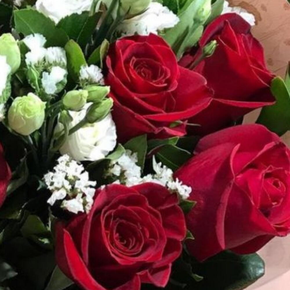 статис уайт - 3 шт. біла троянда - 2 шт. rosa roja - 6 шт. verdes variados - 5 шт. лізіантус або білі альстромерії - 2 шт.
