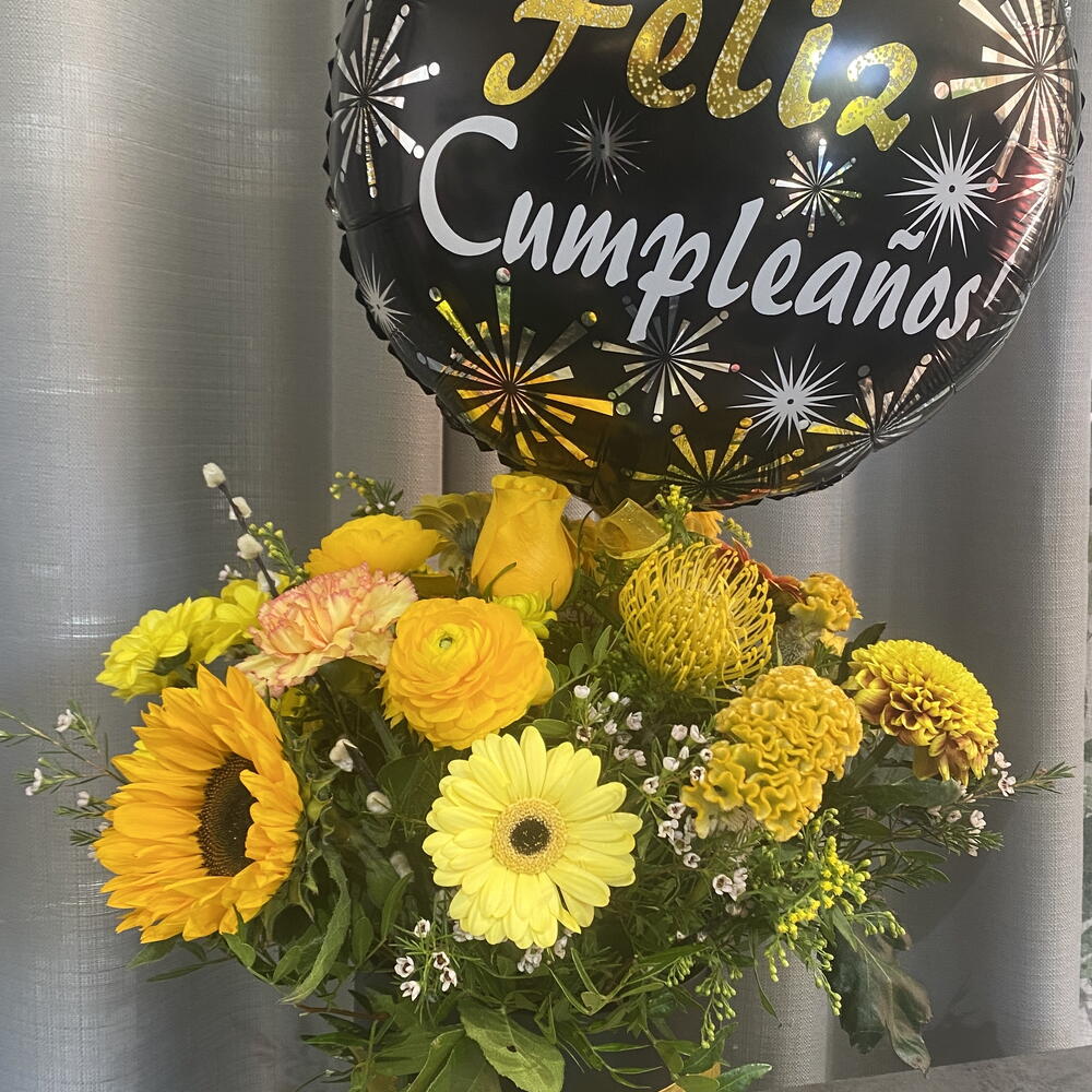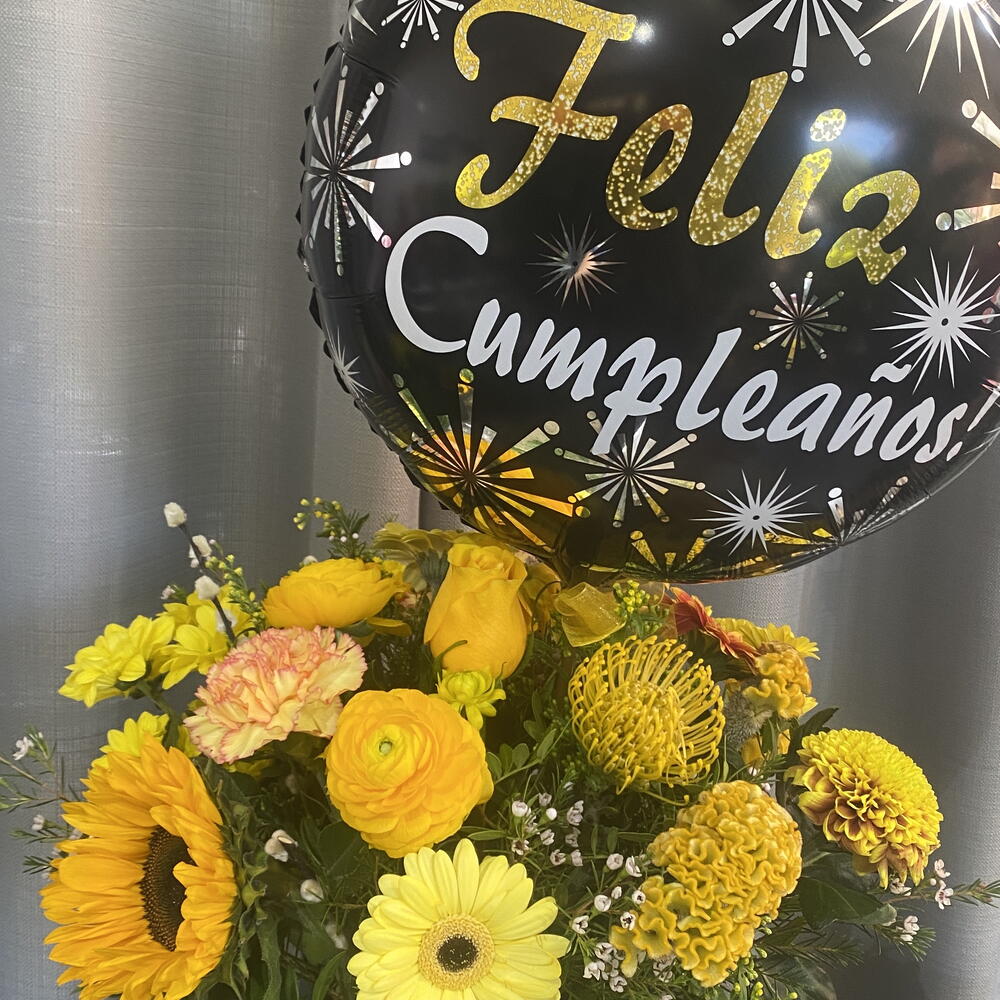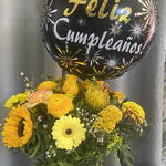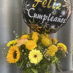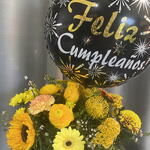 Solidago - 3 шт. Gerbera - 3 шт. claveles - 3 шт. rosas amarillas - 3 шт. жовті маргаритки - 3 шт. середні соняшники - 2 шт. повітряна кулька з днем народження - 1 шт. шляпна коробка з оазисом - 1 шт.