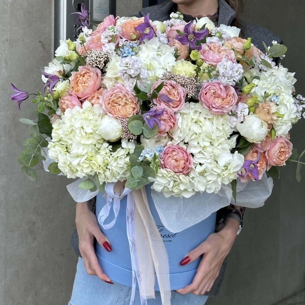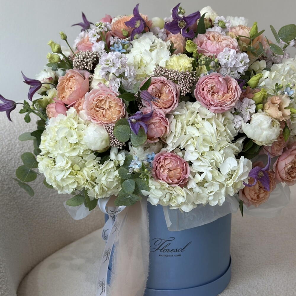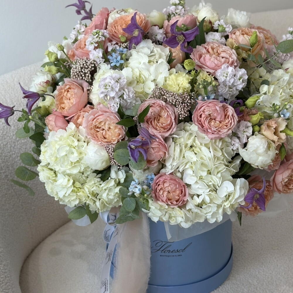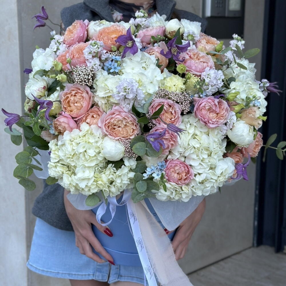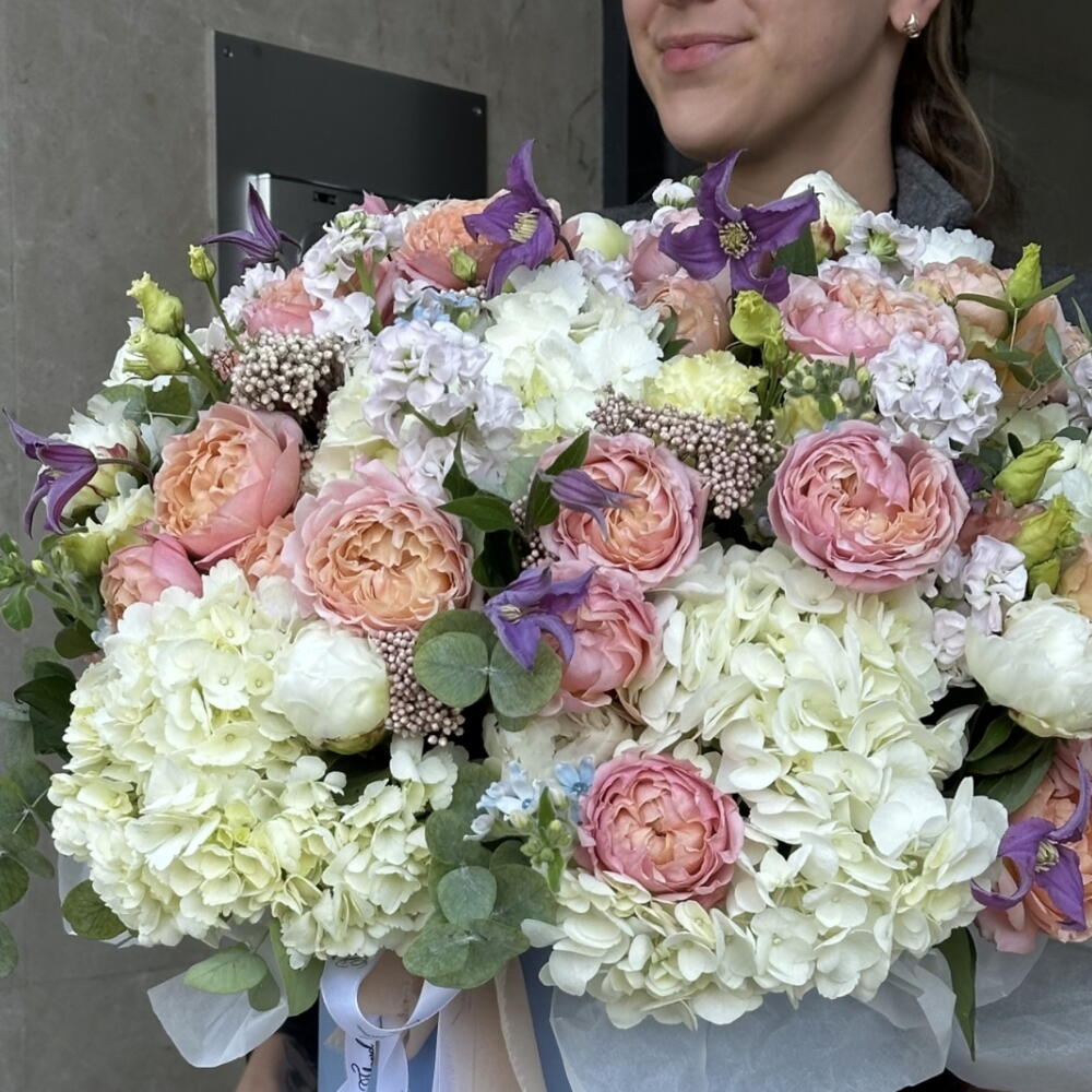 hortensia - 8 шт. Clematis - 6 шт. Lisianthus - 4 шт. Peony - 15 шт. matthiola - 11 шт. квітка рису - 7 шт. оксипеталум - 7 шт. роза джульєта - 7 шт.