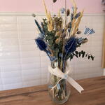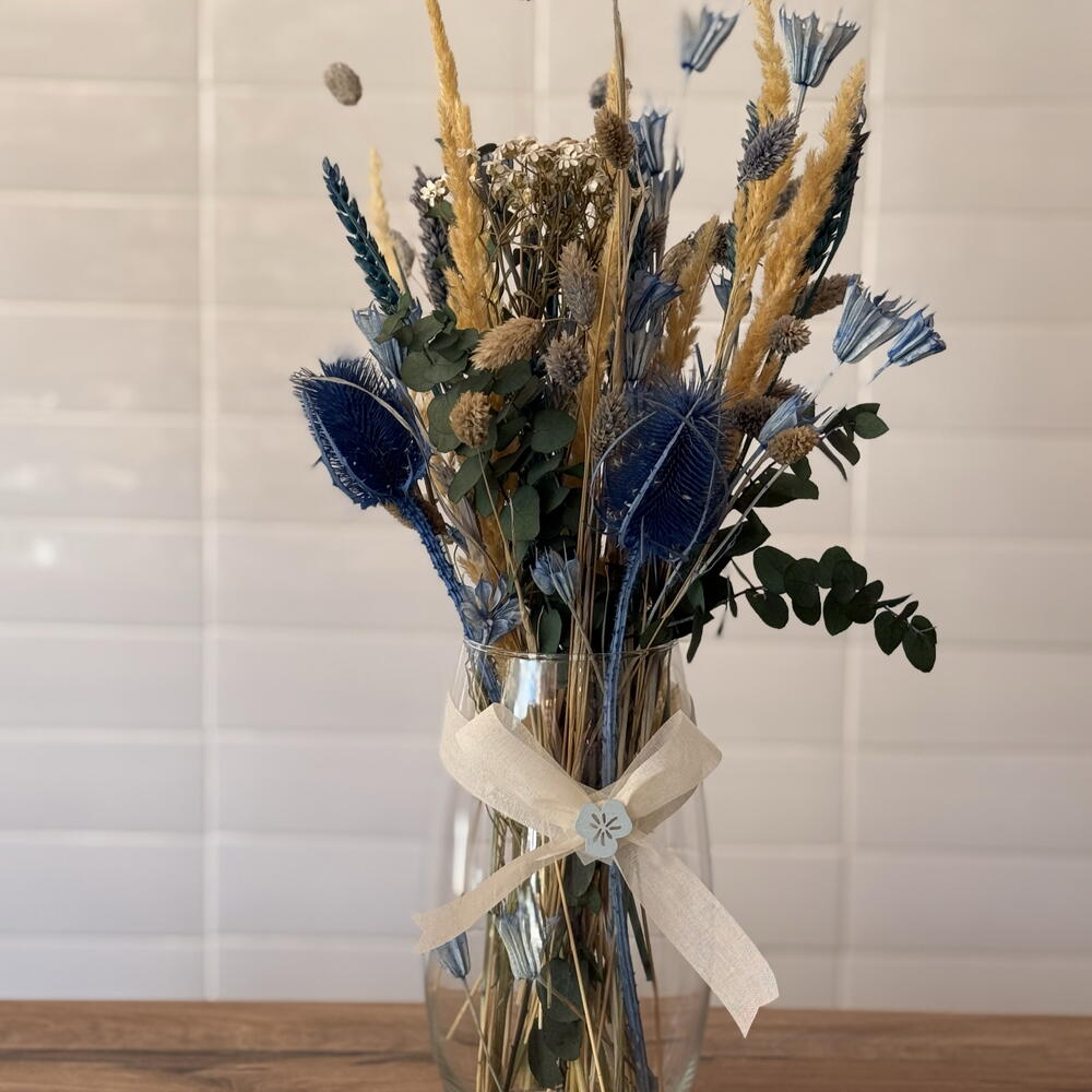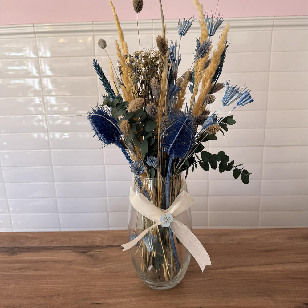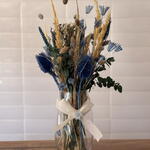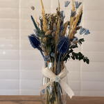 lagurus - 5 шт. скляна ваза - 1 шт. сухий phalaris - 4 шт. бантик і декор - 1 шт. синя пшениця - 10 шт. сушений амарант - 5 шт. натуральна суха пампасна трава - 8 шт. сухий консервований евкаліпт - 3 шт. сині чертополохи - 3 шт.