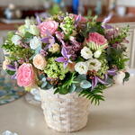 Basket - 1 шт. Wax flower - 3 шт. greenary - 5 шт. klematis - 5 шт. білі стебла еустоми - 4 шт. рожевий антуріум - 5 шт. світло-рожеві троянди - 7 шт. кремові кущові троянди - 4 шт.