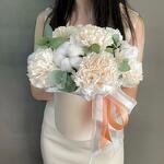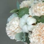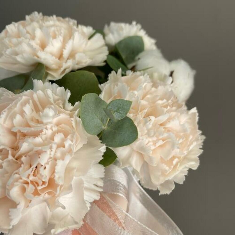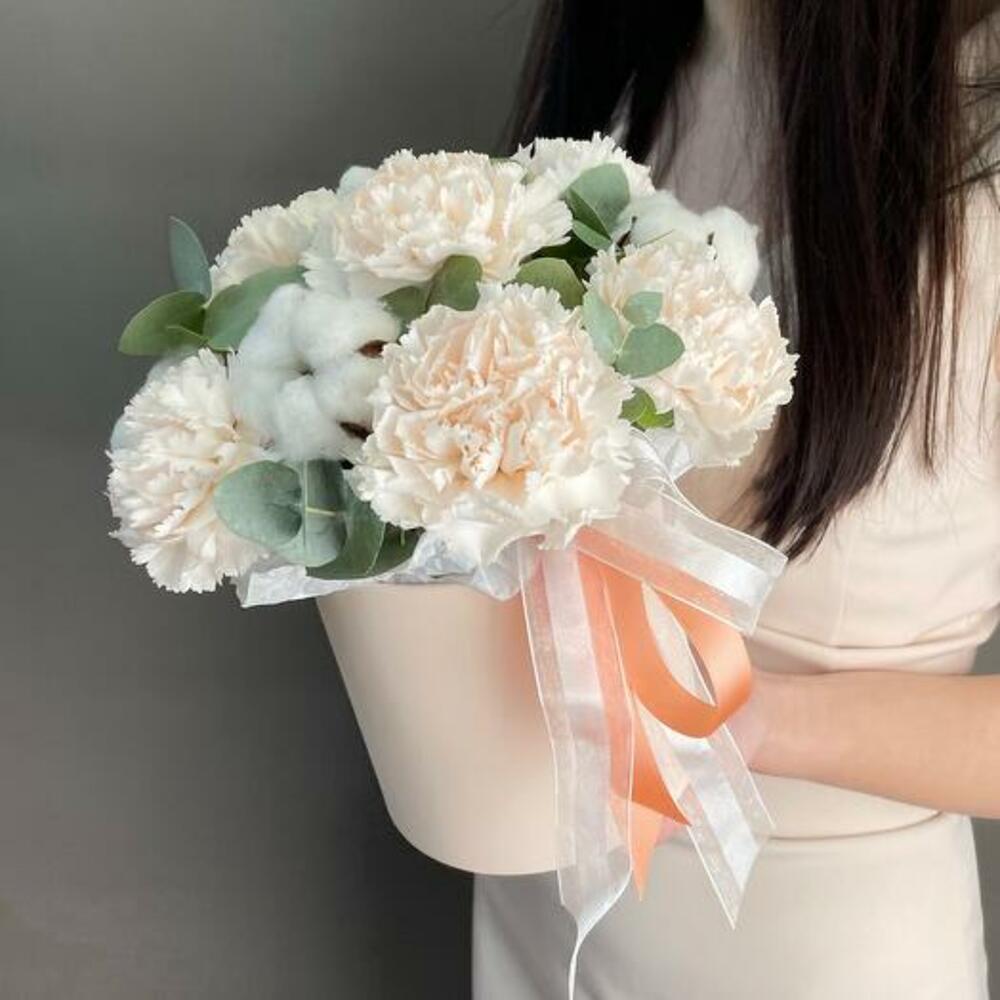 Чарівна композиція в капелюшній коробці з кремової гвоздики та бавовни з ароматним евкаліптом стане чудовим подарунком на день народження, мамі, дружині, подрузі, дівчині чи колезі, на річницю, випускний, 8 березня, День матері та іншу святкову подію. А можливо, просто щоб порадувати свою другу половинку.