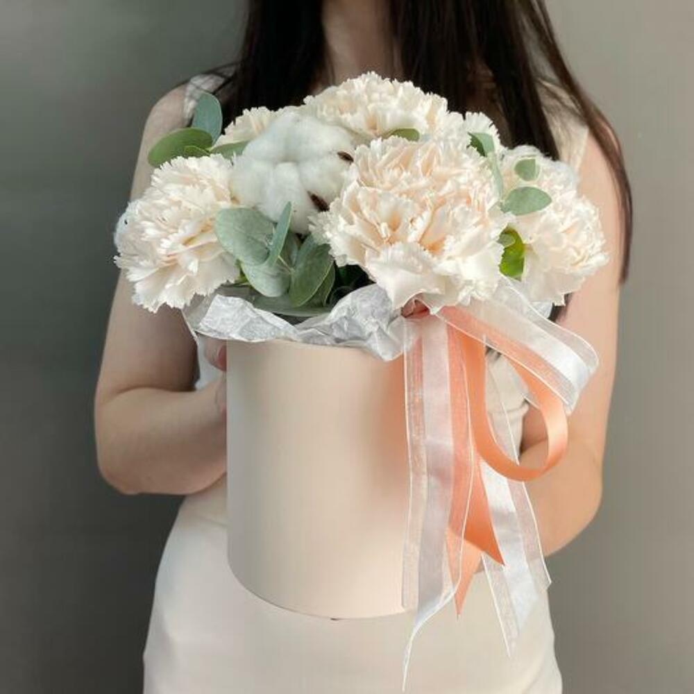 Квіти в коробці: кремові гвоздики з бавовною та евкаліптом