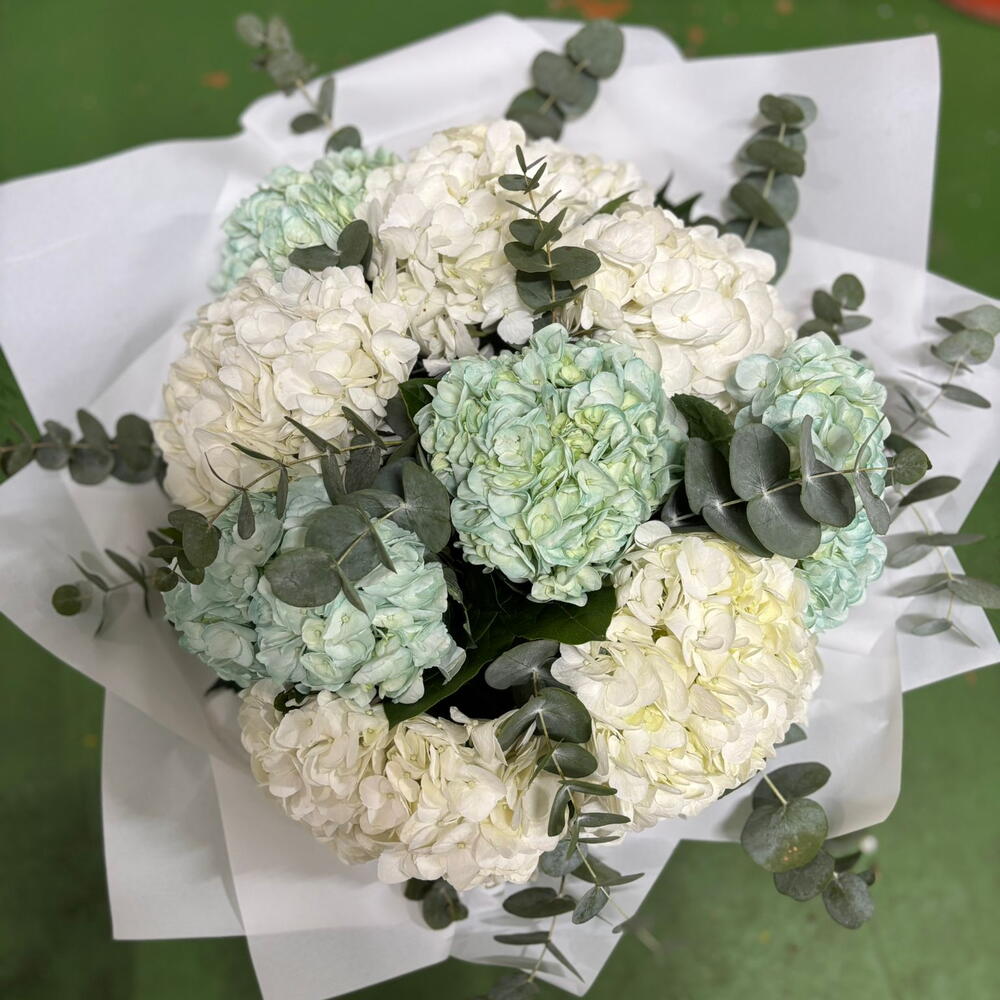 Цей класичний букет – ідеальна композиція для будь-якої події. Він містить 9 гортензій, що надають йому елегантності та вишуканості. Їх доповнюють 5 стебел евкаліпта цинереї, що забезпечують свіжий та ніжний аромат. Також додається п'ять різноманітних зелених листків, що створюють гарний контраст кольорів та природний вигляд. Як завершальний штрих, до букету додається преміальний декоративний елемент, що робить його справді унікальним декоративним елементом.