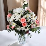Цей чарівний букет з білих ромашок та рожевих гвоздик передає чистоту та свіжість у кожній квітці. Його ніжне поєднання м'яких тонів робить його ідеальною композицією для вираження ніжності та вдячності, ідеальною для будь-якої особливої події. З ноткою евкаліпта, яка підкреслює його свіжість, цей букет ідеально підійде для наповнення будь-якого простору вашого дому світлом та спокоєм.