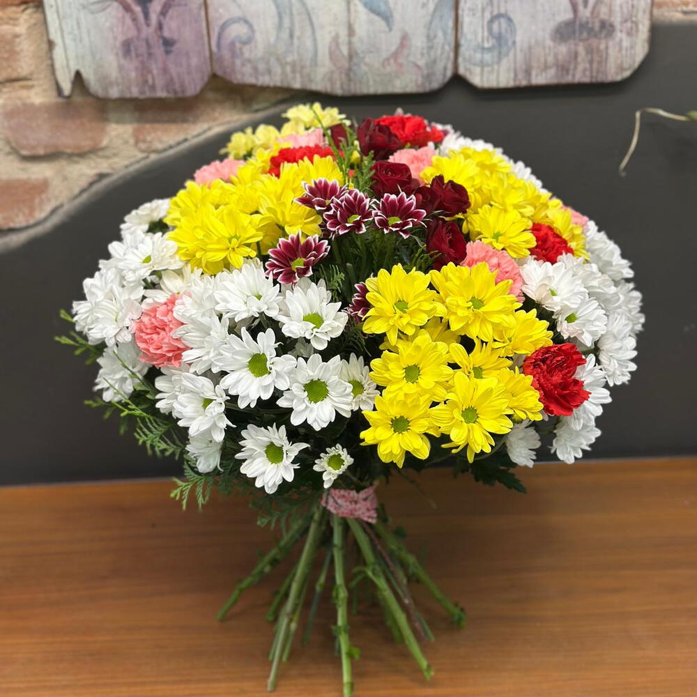 рожева гвоздика - 6 шт. verdes variados - 1 шт. червона гвоздика - 6 шт. різноманітна маргаритка - 10 шт.