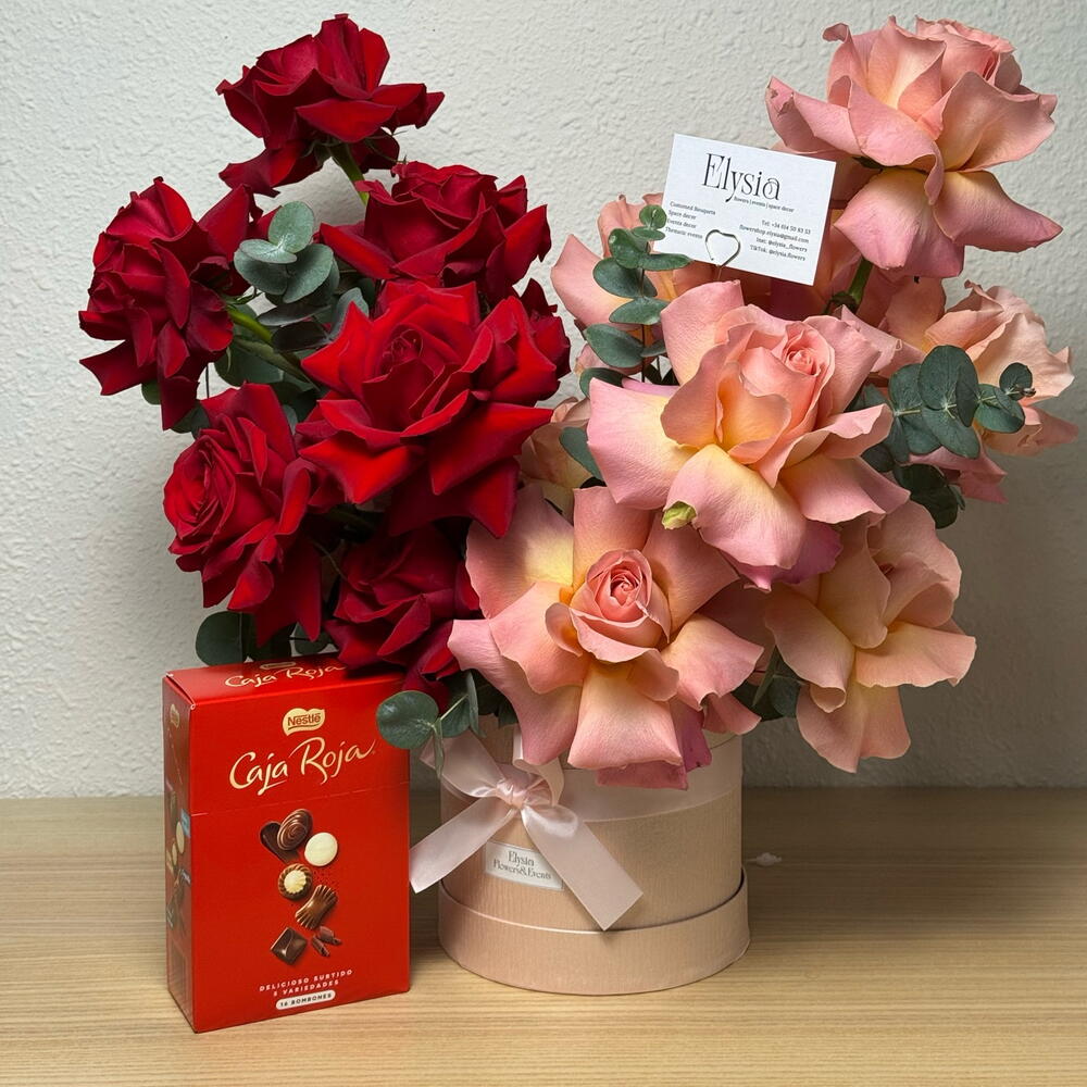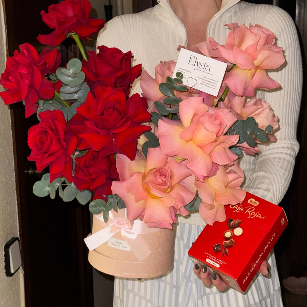 Eucalyptus - 5 шт. французька троянда рожева - 11 шт. французька червона троянда - 10 шт. коробка шоколадних цукерок червона коробка nestle - 1 шт.