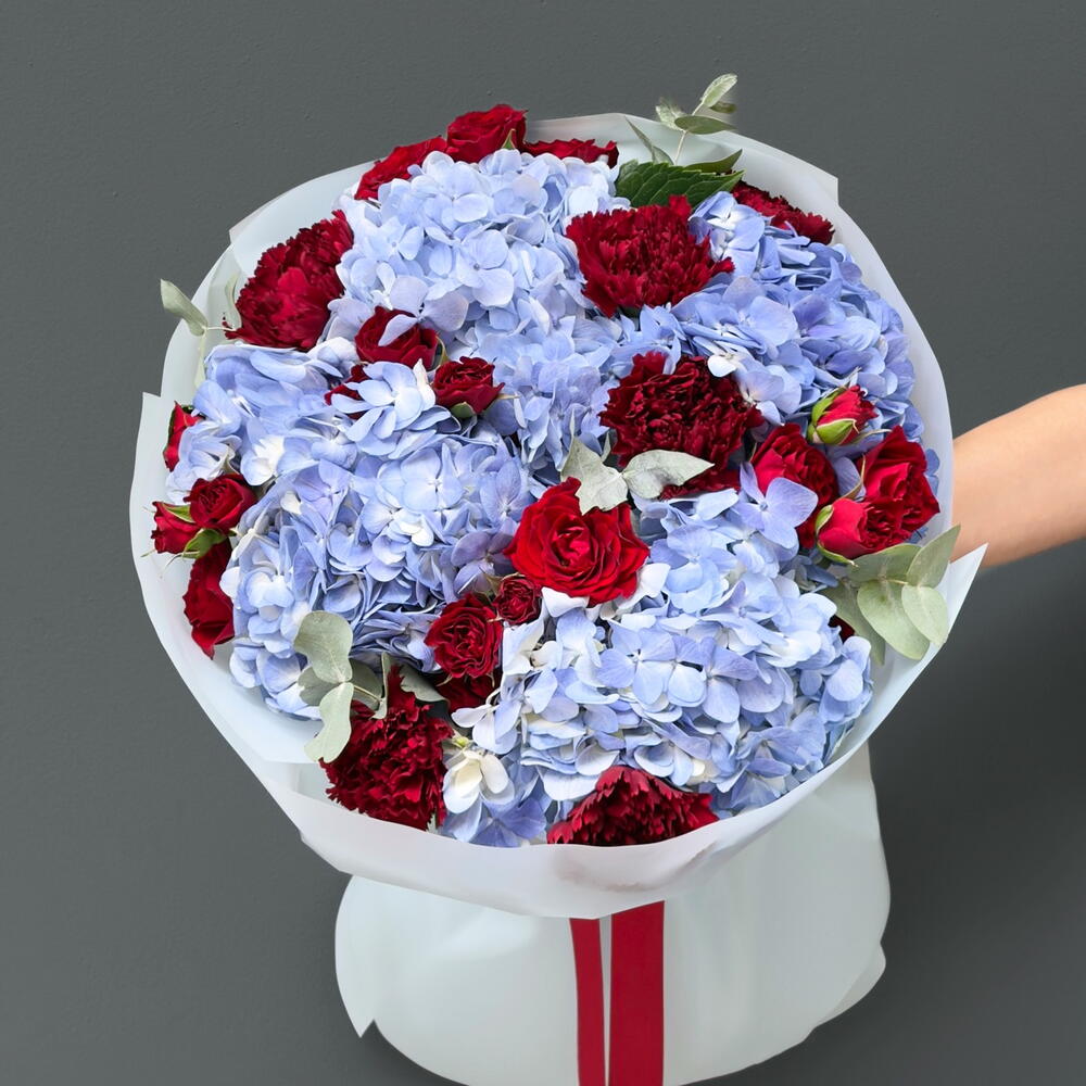 Eucalyptus - 5 шт. hortensia - 4 шт. clavel - 6 шт. rosa spray - 5 шт.