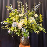 Ця прекрасна квіткова композиція з категорії «Авторський» справді є витвором мистецтва. Містить вишукану суміш зелені в різноманітних відтінках - 8 одиниць, прикрашену інтенсивним кольором синьої гортензії - 3 одиниці і делікатним шармом кремової троянди - 2 одиниці. Живий акцент створює синій дельфініум - 10 одиниць, за яким слідує романтичний шарм кремової півонії - 4 одиниці. Хризантема кремового кольору - 3 одиниці і клематис лілового кольору - 3 одиниці додають нотку вишуканості, тоді як декоративний кріп - 2 одиниці і зелена еустома - 3 одиниці надають текстуру та свіжість. Квіткова композиція, створена, щоб вразити!