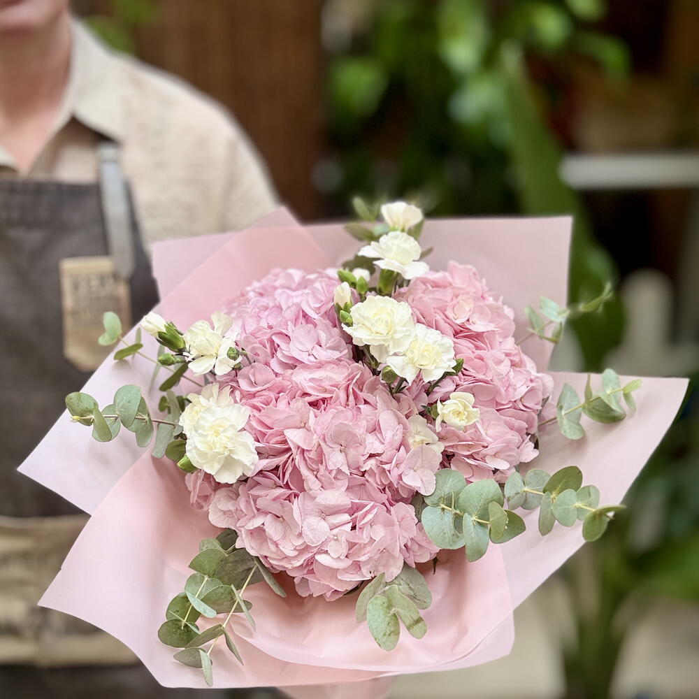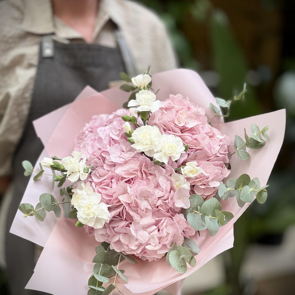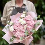 Букет, сповнений свіжості та романтики: рожеві гортензії додають об'єму й ніжності, білі міні-гвоздики додають елегантності, а евкаліпт завершує композицію природним штрихом. Ідеально підходить для подарунка в особливий момент або просто щоб подарувати радість у повсякденні.